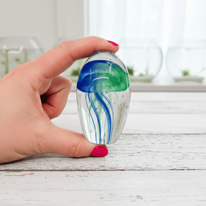 Enchant your home or office with this charming Glow-in-the-Dark Jellyfish Pebble Paperweight. It captures the unique serenity of the ocean adding an inviting touch of beachy ambiance to any room. After dark, it softy glows, radiating a captivating luminescence.