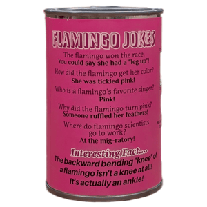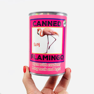 • 1 plush flamingo sealed in a tin can. Peel back the pop top lid to reveal your amazingly soft, new best friend!