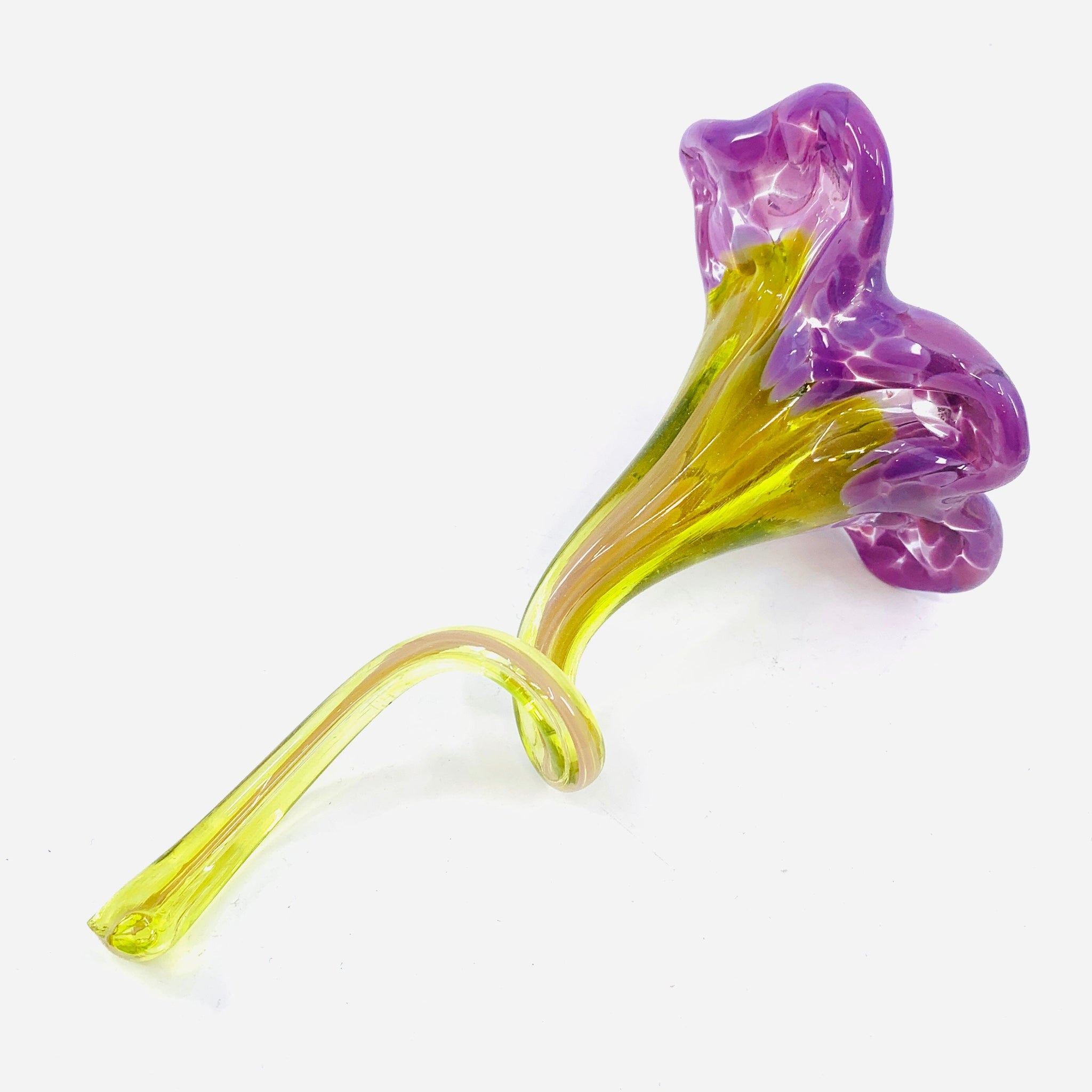 This handblown pulled flower was created at Luke Adams Glass Blowing Studio. There are certain color palettes we have made in limited batches so shape and size might vary, get yours while they are still available!