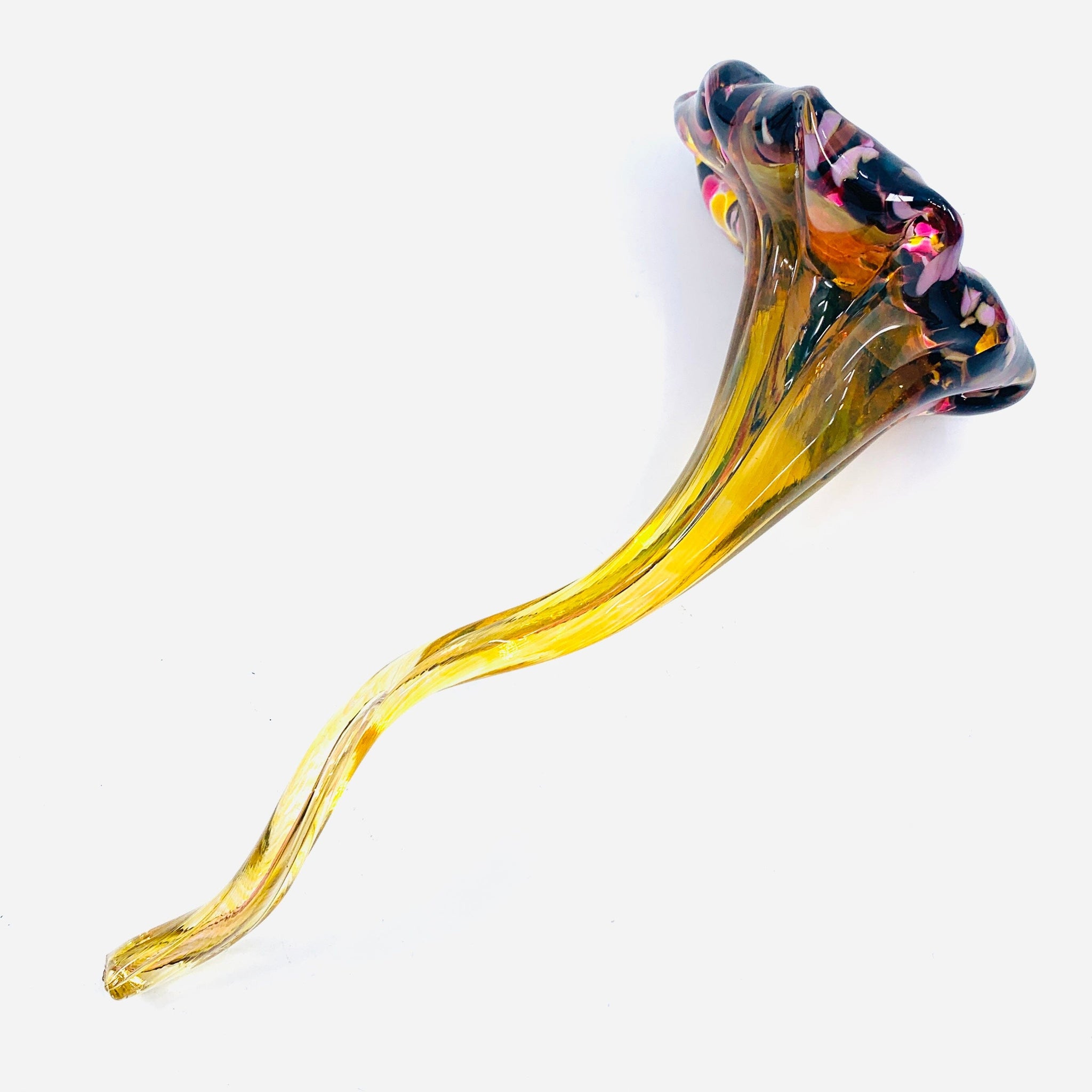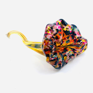 This handblown pulled flower was created at Luke Adams Glass Blowing Studio. There are certain color palettes we have made in limited batches so shape and size might vary, get yours while they are still available!