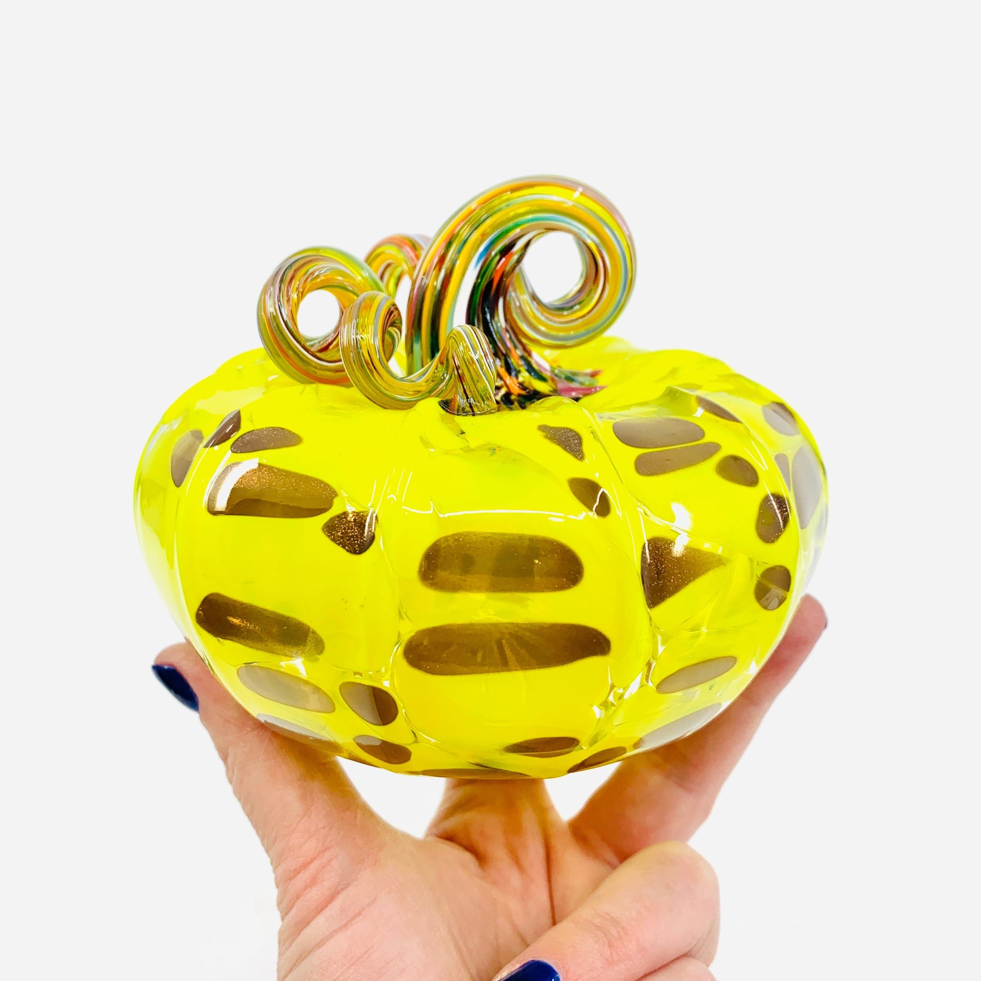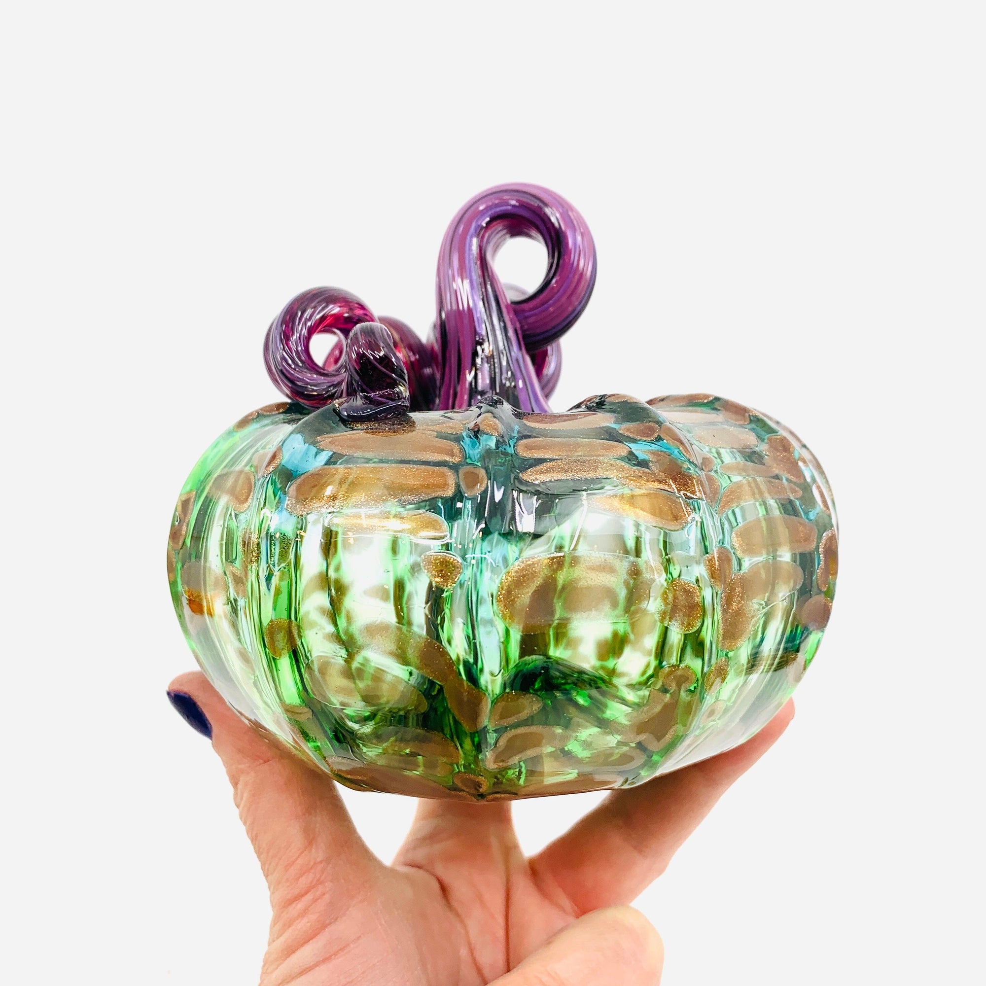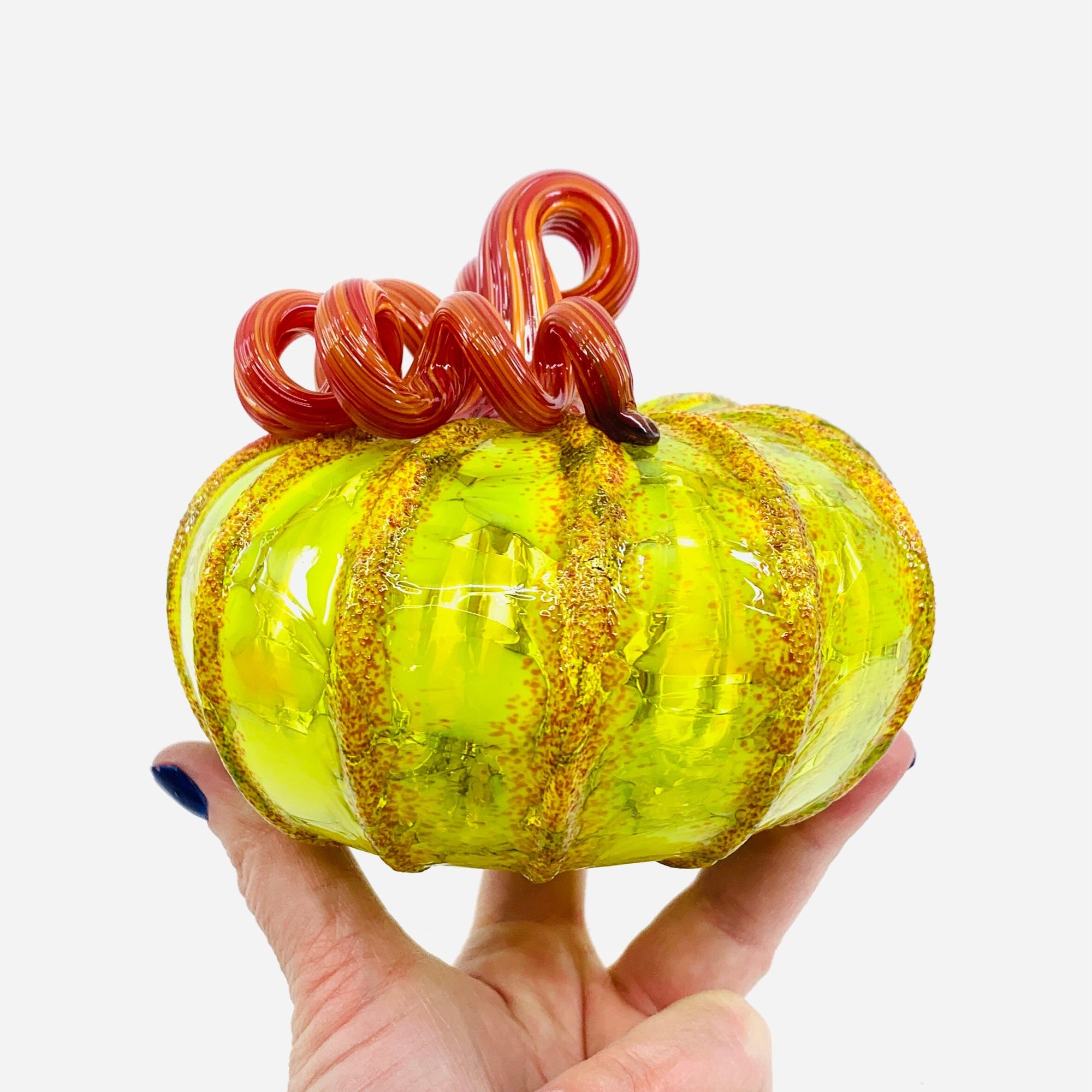 Our signature glass pumpkins, handmade in the Luke Adams Glassblowing Studio. Pumpkins come in a variety of colors and sizes. Many are unique and one of a kind. New pumpkins daily.