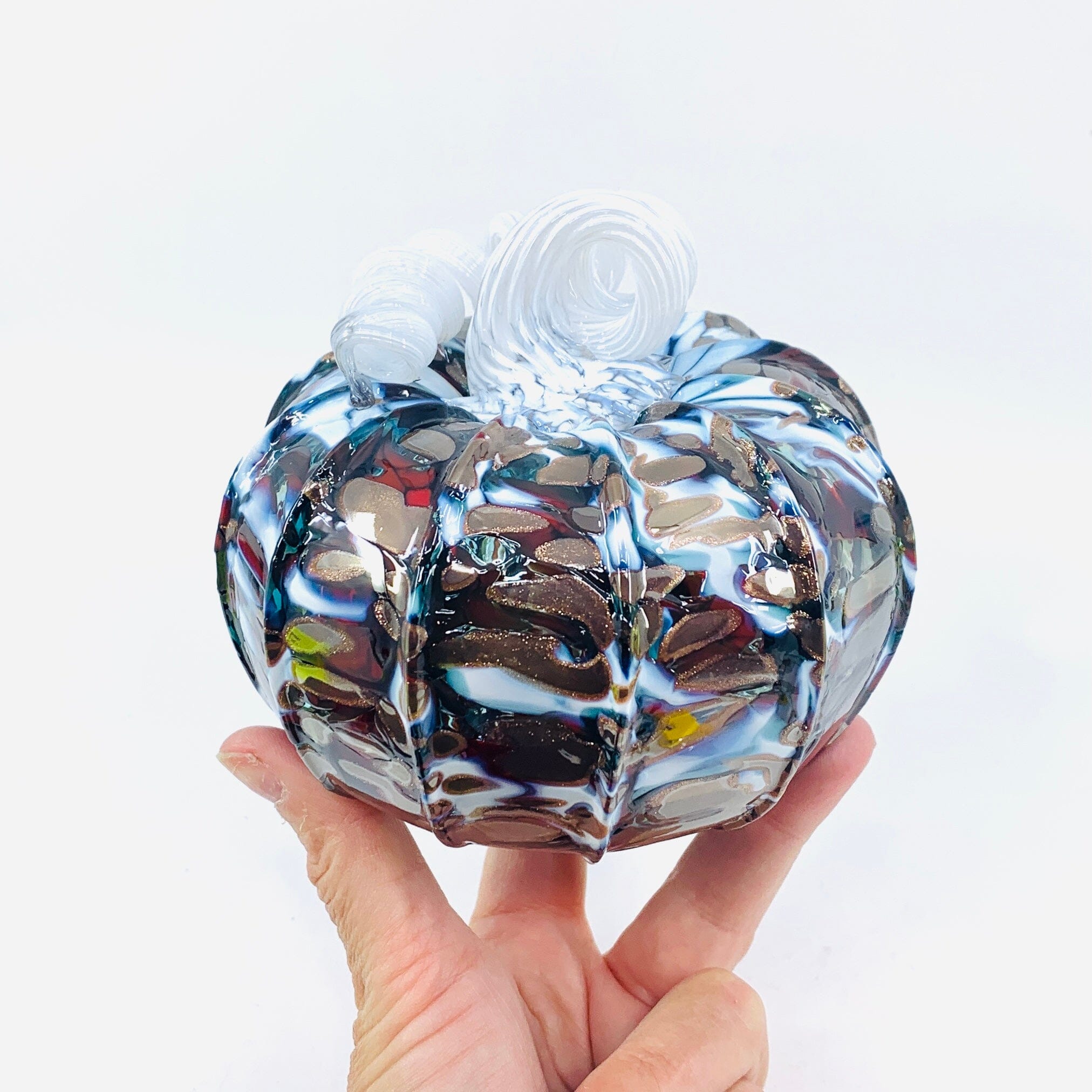 What's a daily pumpkin? Daily pumpkins are artfully created by our team of glassblowers. Shapes, sizes, colors, and patterns are at their whim! New pumpkins are posted... you guessed it... daily! Please be aware that descriptive terms (i.e. mini, squat) refer to shape more so than dimensions of our daily pumpkins due to the individuality of these pieces. Size and uniformity may vary.