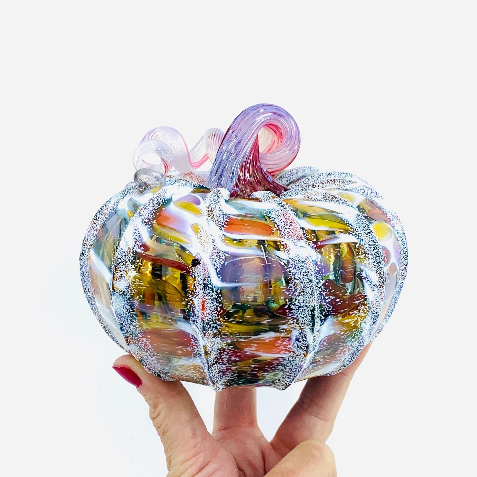 What is a Daily Pumpkin? Every day brings a fresh creation from our glassblowing studio! Our Daily Pumpkins are one-of-a-kind pieces where our artisans let their creativity run wild—no two are exactly alike. Each pumpkin showcases unique colors, patterns, and silhouettes, making yours truly special. Shape descriptors like "mini" or "squat" capture the vibe rather than precise measurements, so expect delightful variations in size and character. Check back daily for new arrivals!
