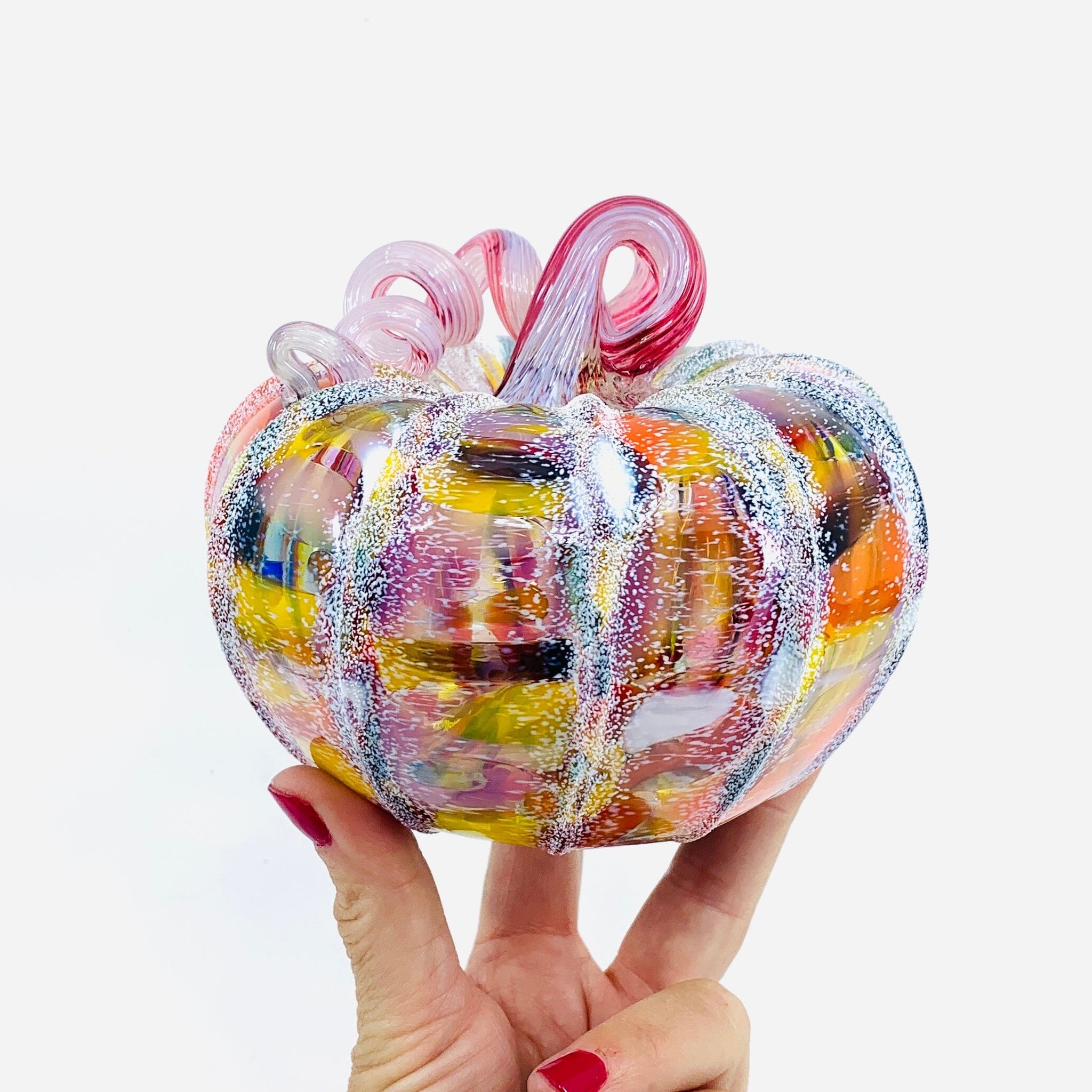 What is a Daily Pumpkin? Every day brings a fresh creation from our glassblowing studio! Our Daily Pumpkins are one-of-a-kind pieces where our artisans let their creativity run wild—no two are exactly alike. Each pumpkin showcases unique colors, patterns, and silhouettes, making yours truly special. Shape descriptors like "mini" or "squat" capture the vibe rather than precise measurements, so expect delightful variations in size and character. Check back daily for new arrivals!
