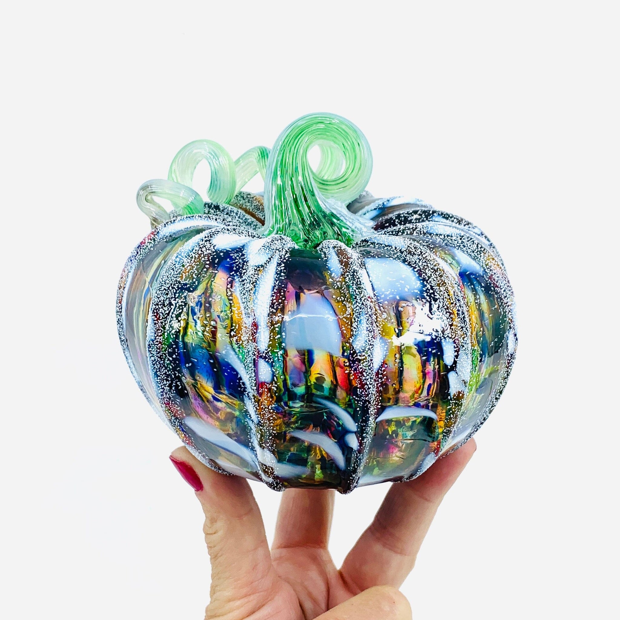 What is a Daily Pumpkin? Every day brings a fresh creation from our glassblowing studio! Our Daily Pumpkins are one-of-a-kind pieces where our artisans let their creativity run wild—no two are exactly alike. Each pumpkin showcases unique colors, patterns, and silhouettes, making yours truly special. Shape descriptors like "mini" or "squat" capture the vibe rather than precise measurements, so expect delightful variations in size and character. Check back daily for new arrivals!