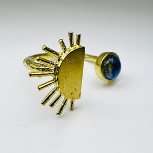 Is there anything more beautiful than a sunrise or sunset? Possibly this sunrise jewelry! Everyone needs a little statement ring. This one hits the spot. A beautiful Sun rising above the Earth in a delicate and adjustable gold tone hammered ring. Make any outfit, any style, any moment truly special.