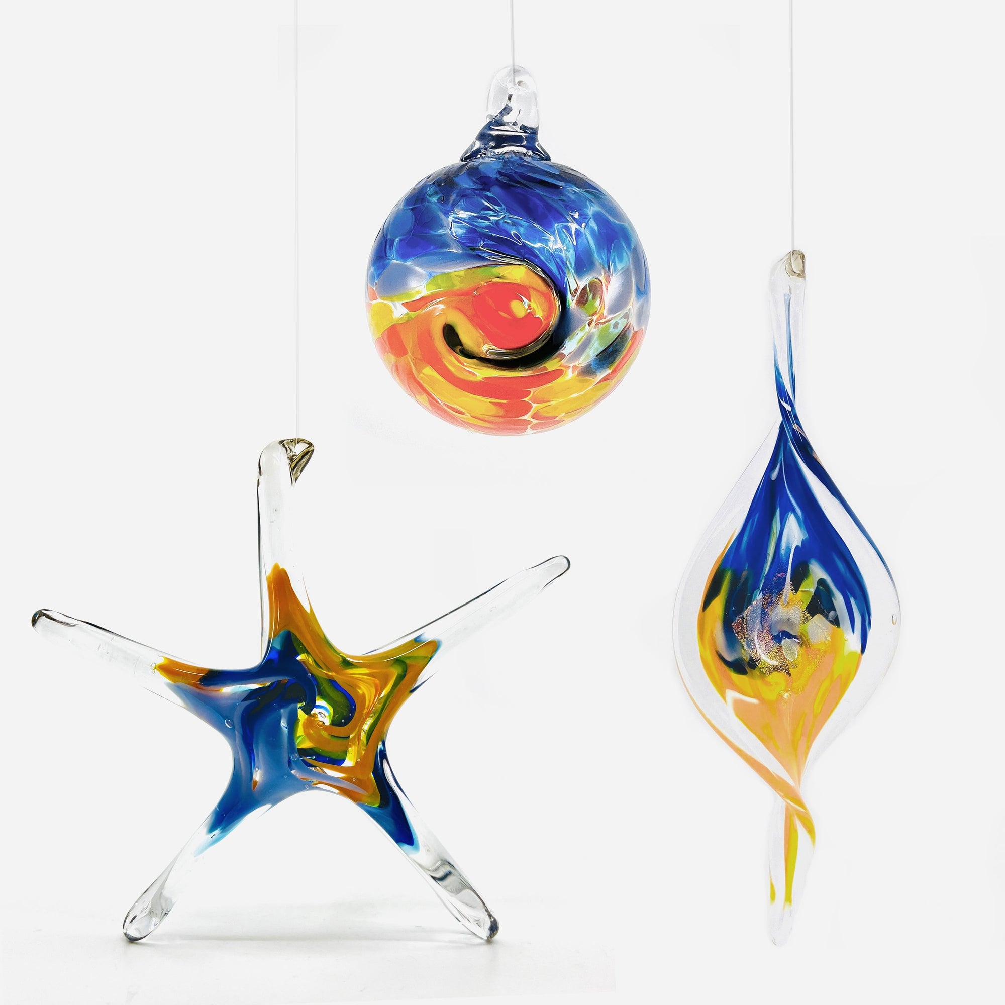 Ornaments, with a twist. Our handmade Spirals are the perfect suncatcher to hang in your window or by a tree branch out in the garden. The glass spiral will gently spin in the breeze, appearing to climb its own string. A unique handmade ornament that catches the light just right.