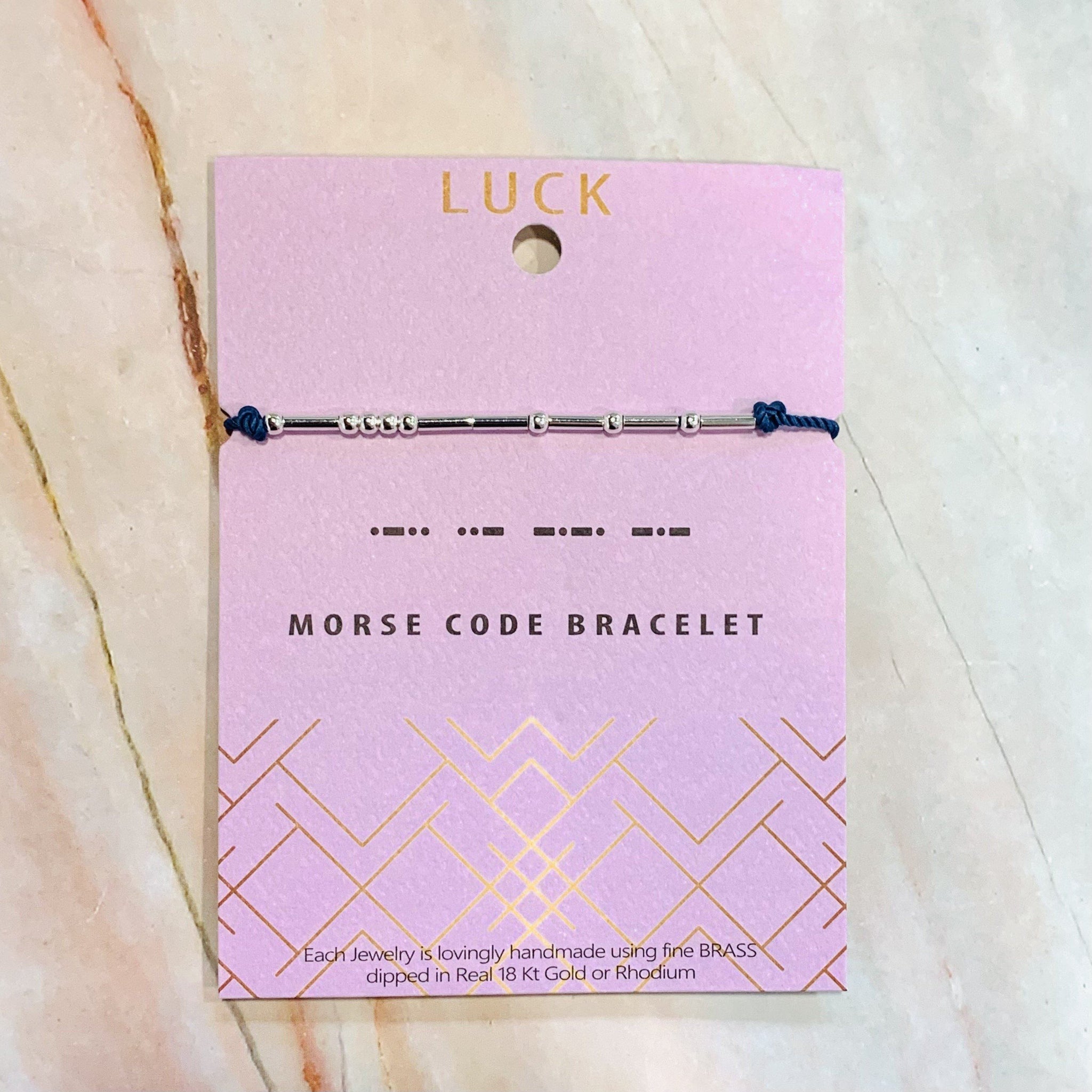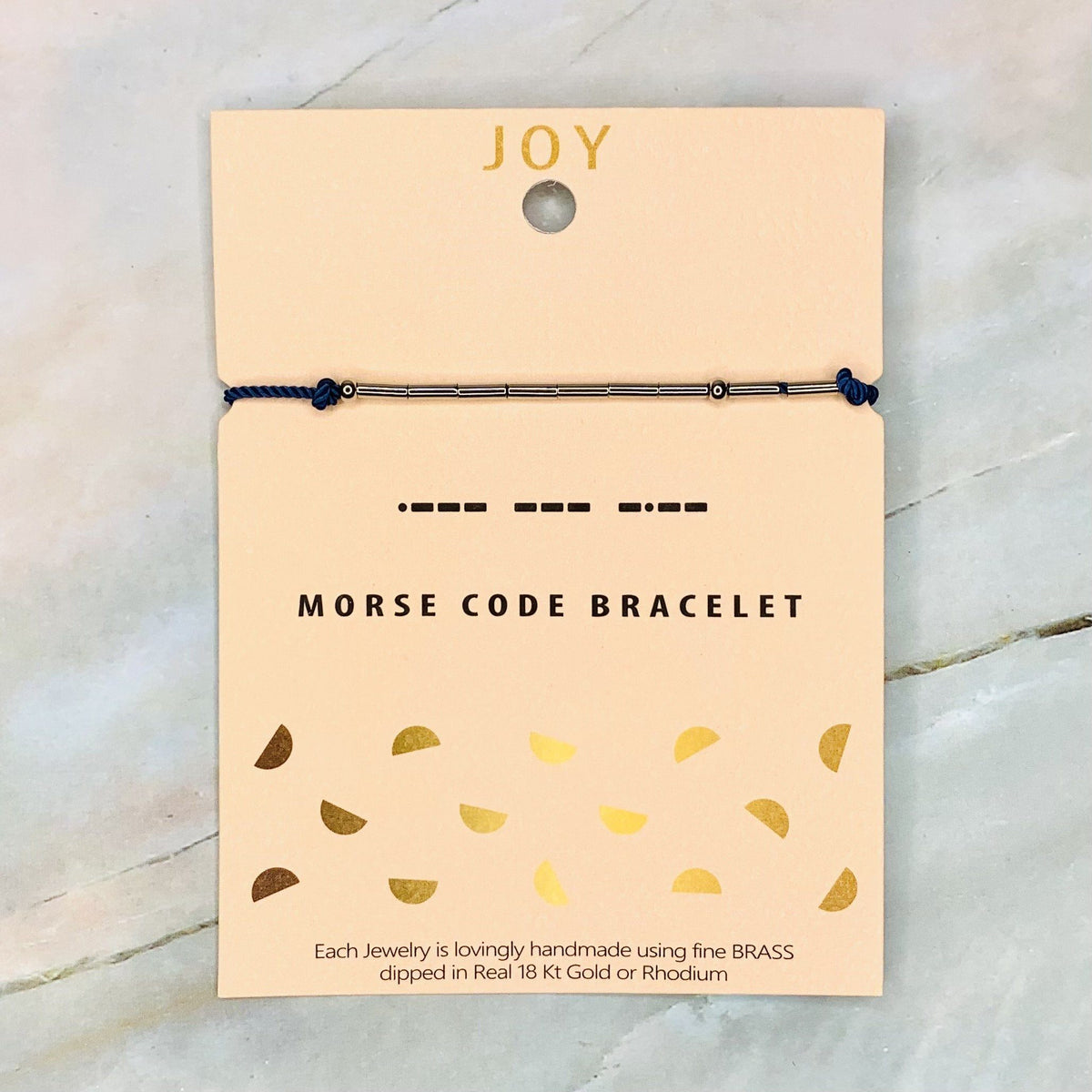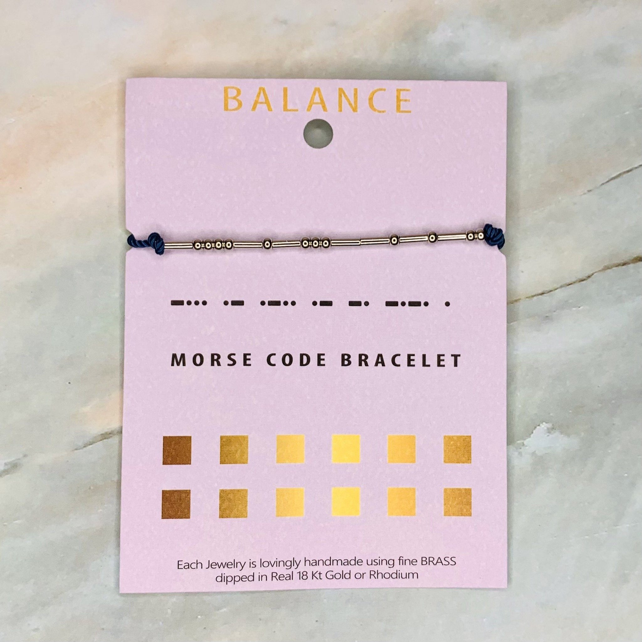 Send a message as a gift with our Morse code bracelets. Each depicts a different word using brass beads and knotted cord. Comes with adjustable sliding clasp.