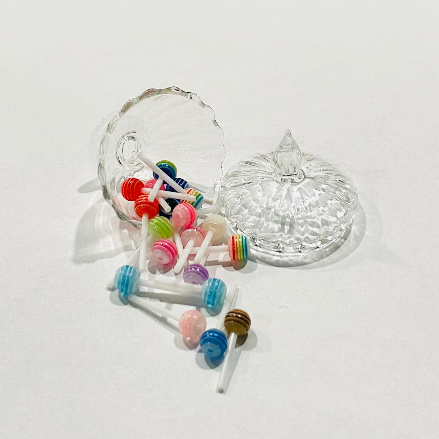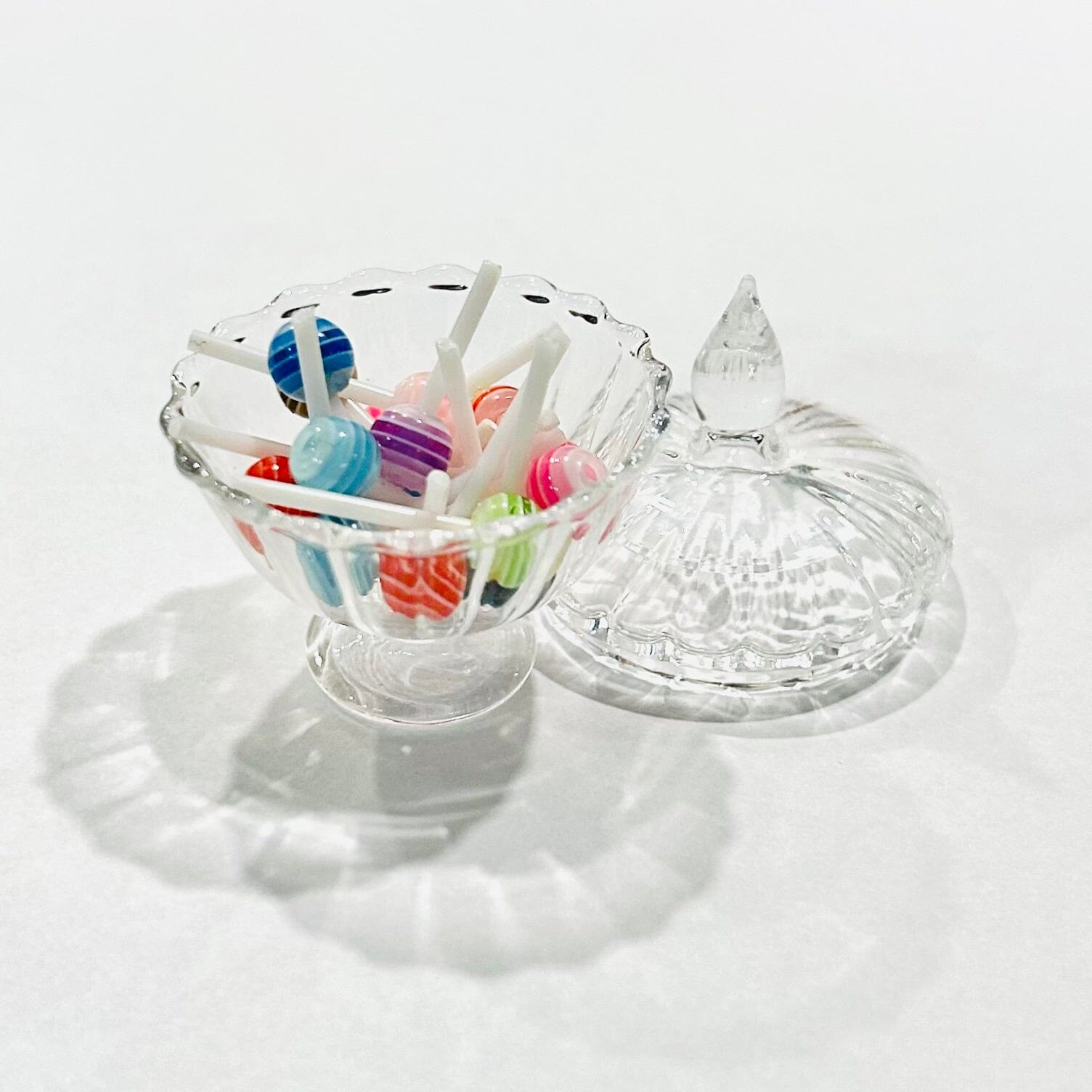 This petite glass candy dish comes complete with miniature lollipops. It's sure to bring joy to all who behold them.