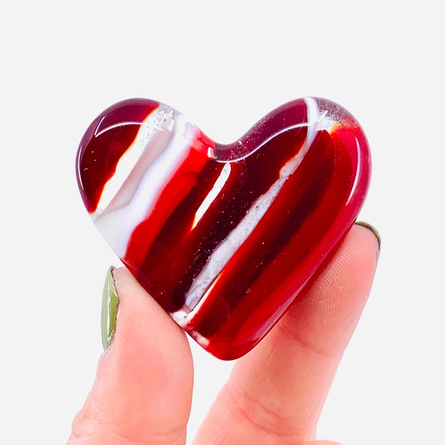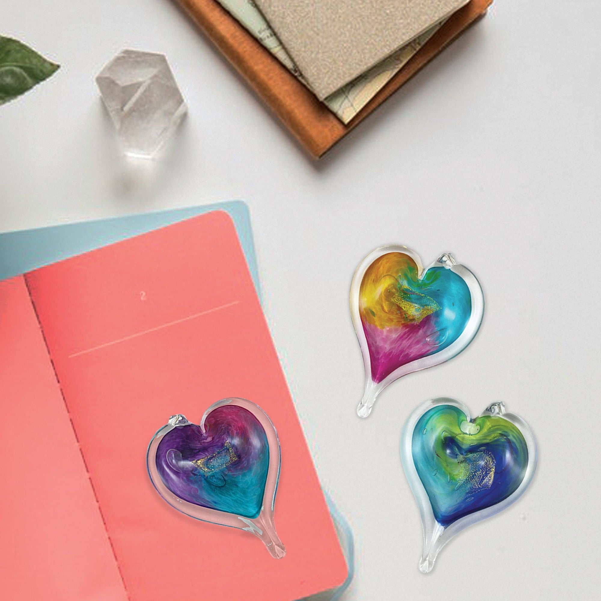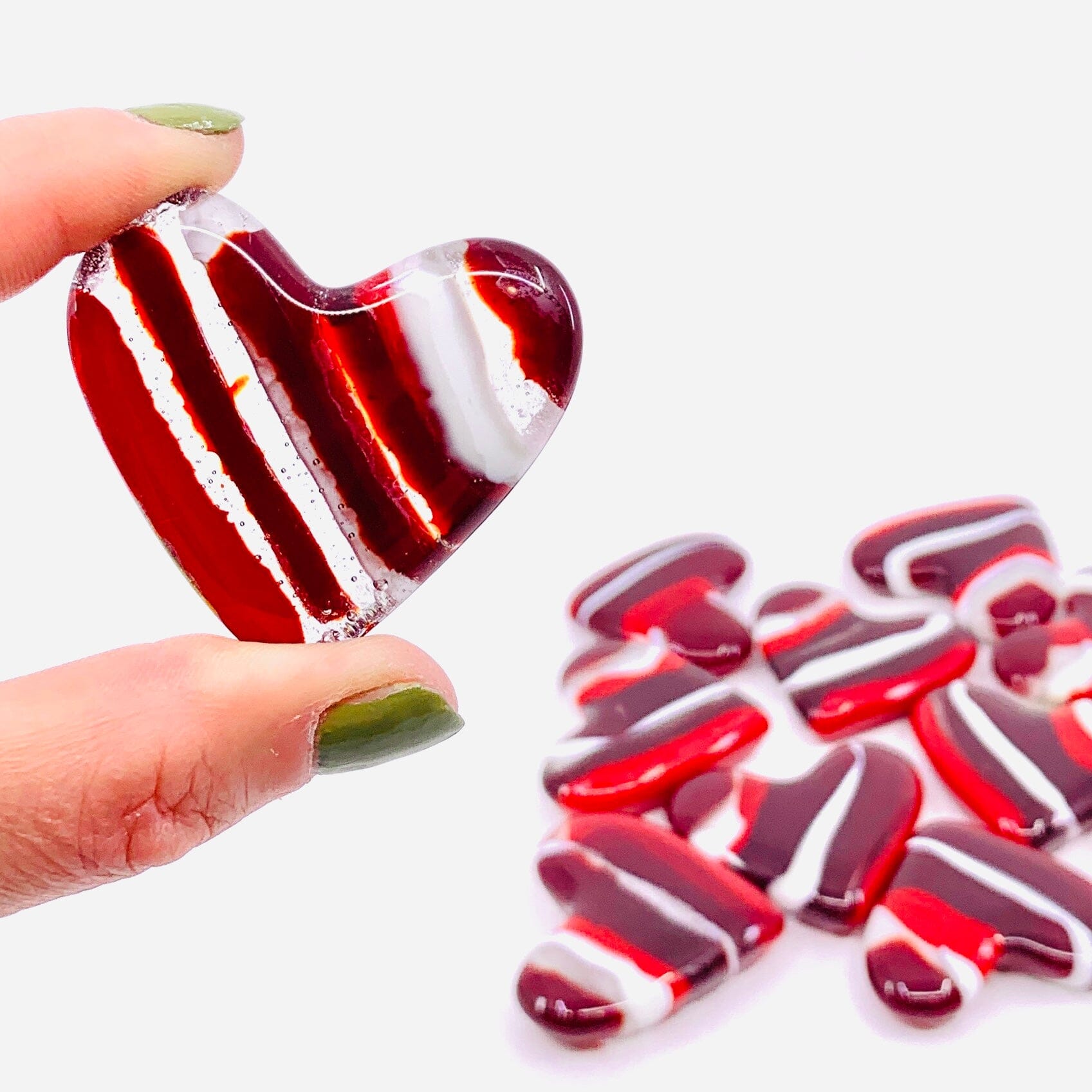 Give the gift of handmade. Small Hearts come in a variety of tri-color combinations, each with a sparkly dichroic center. Each heart is made with a glass loop at the top, making them easy to hang with ribbon, twine or fishing line. Small hearts also look great sitting on a desk or in a succulent pot. The possibilities are endless.