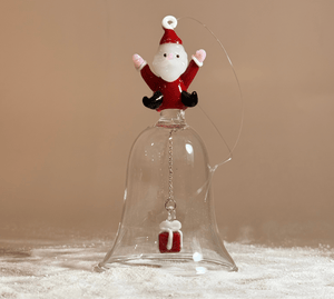 Enhance your holiday decor with this elegant glass bell showcasing a delicate Santa Claus icon with a gift inside. Timeless as a sophisticated bell or a stunning ornament, it makes a memorable gift for loved ones and will captivate your guests throughout the festive season.