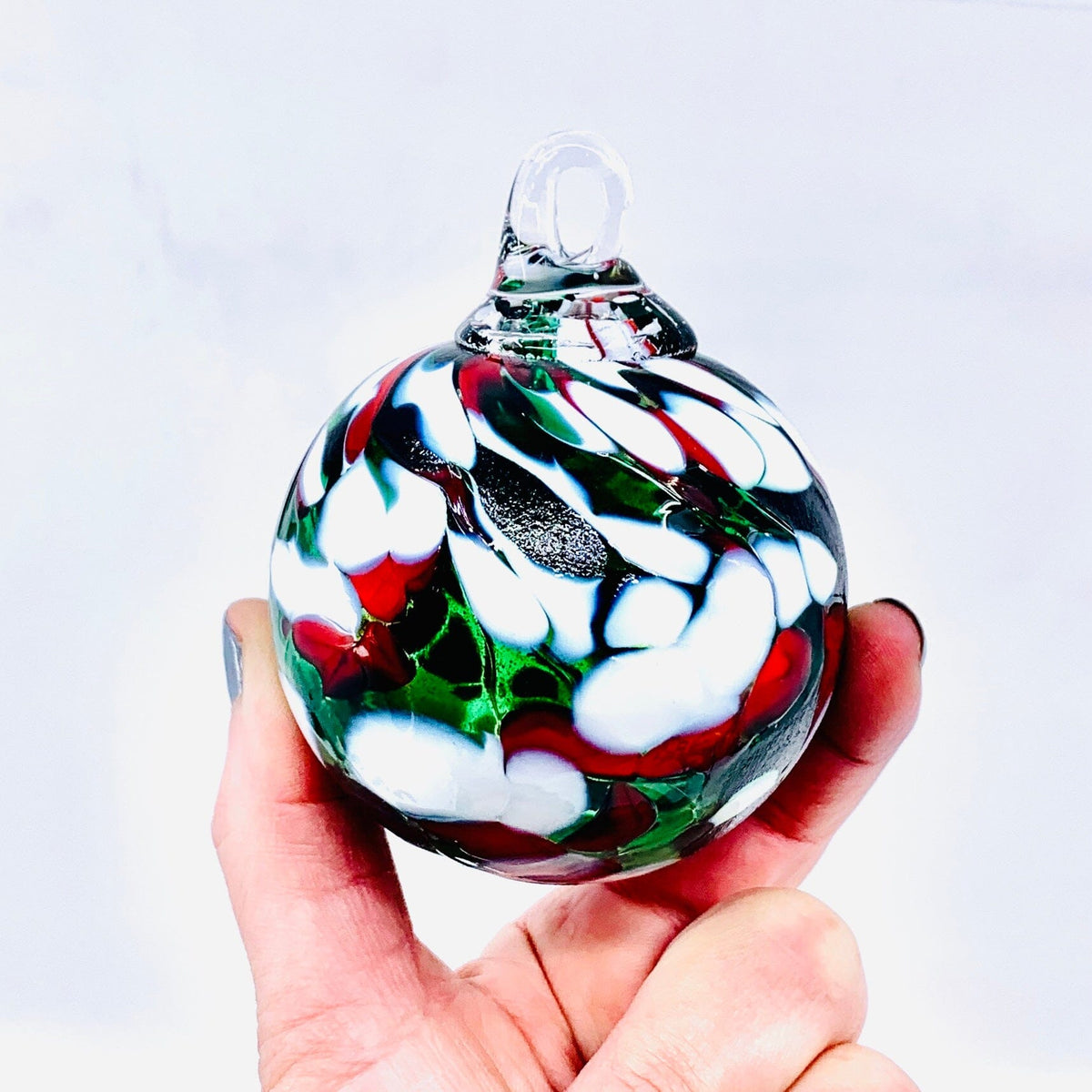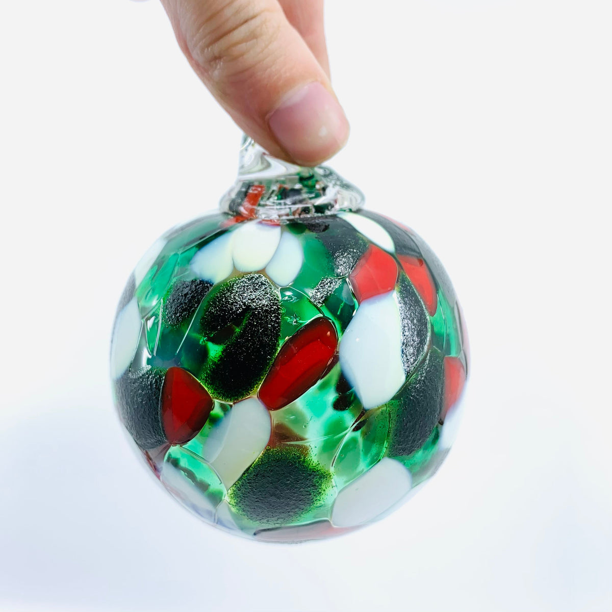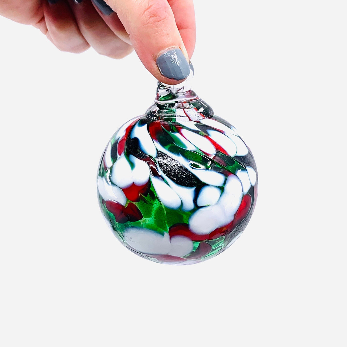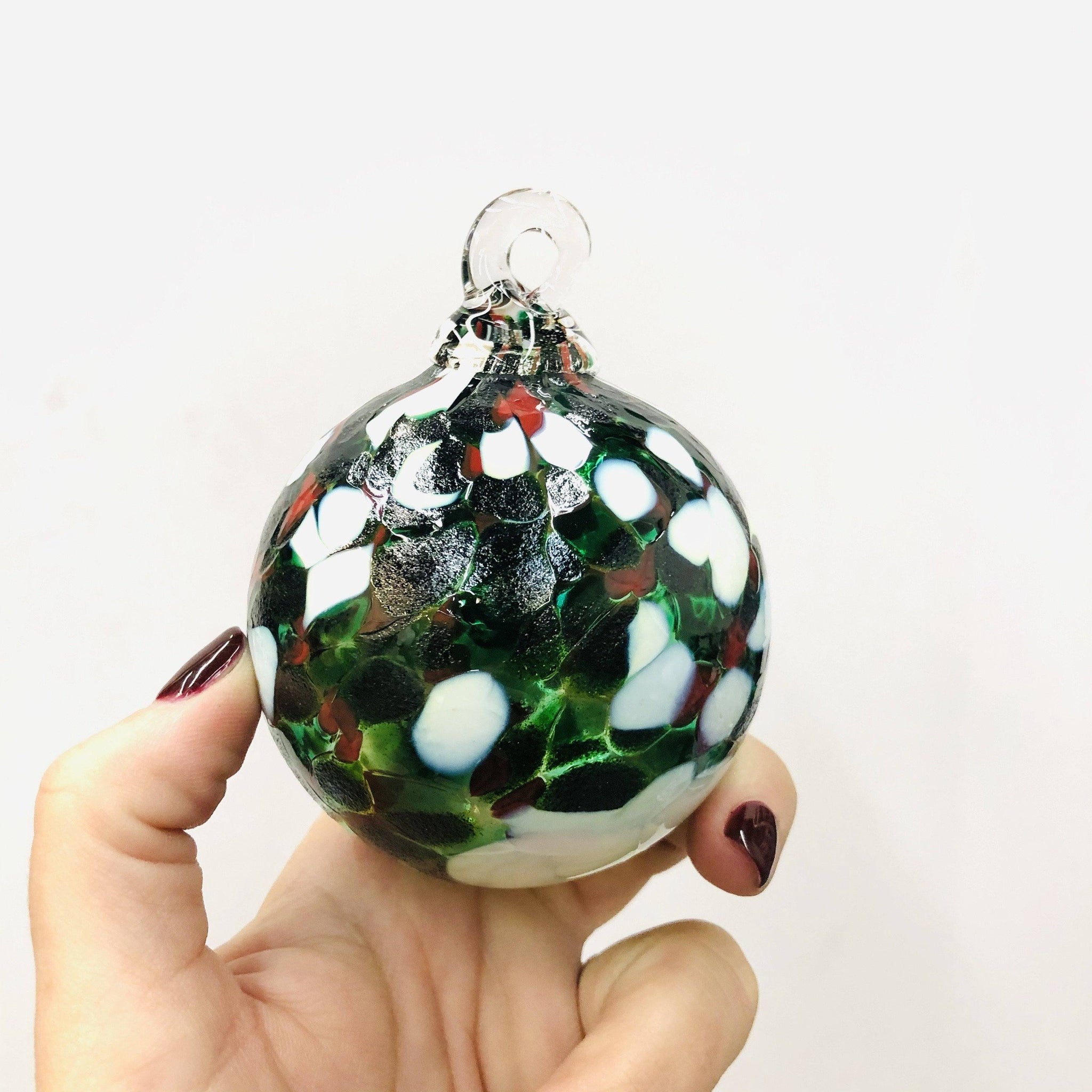 add a touch of holiday charm to your tree with this handmade 3-inch blown glass ornament, crafted with love and care at Luke Adams Glassblowing Studio in Norwood, Massachusetts. The ornament features a beautiful blend of holly green, rich cranberry, and crisp white, evoking the spirit of the season with its vibrant colors and classic design. Perfectly sized for any tree, this ornament offers both delicate beauty and durability. Each piece is individually blown by skilled artisans, ensuring that no two are exactly alike.
