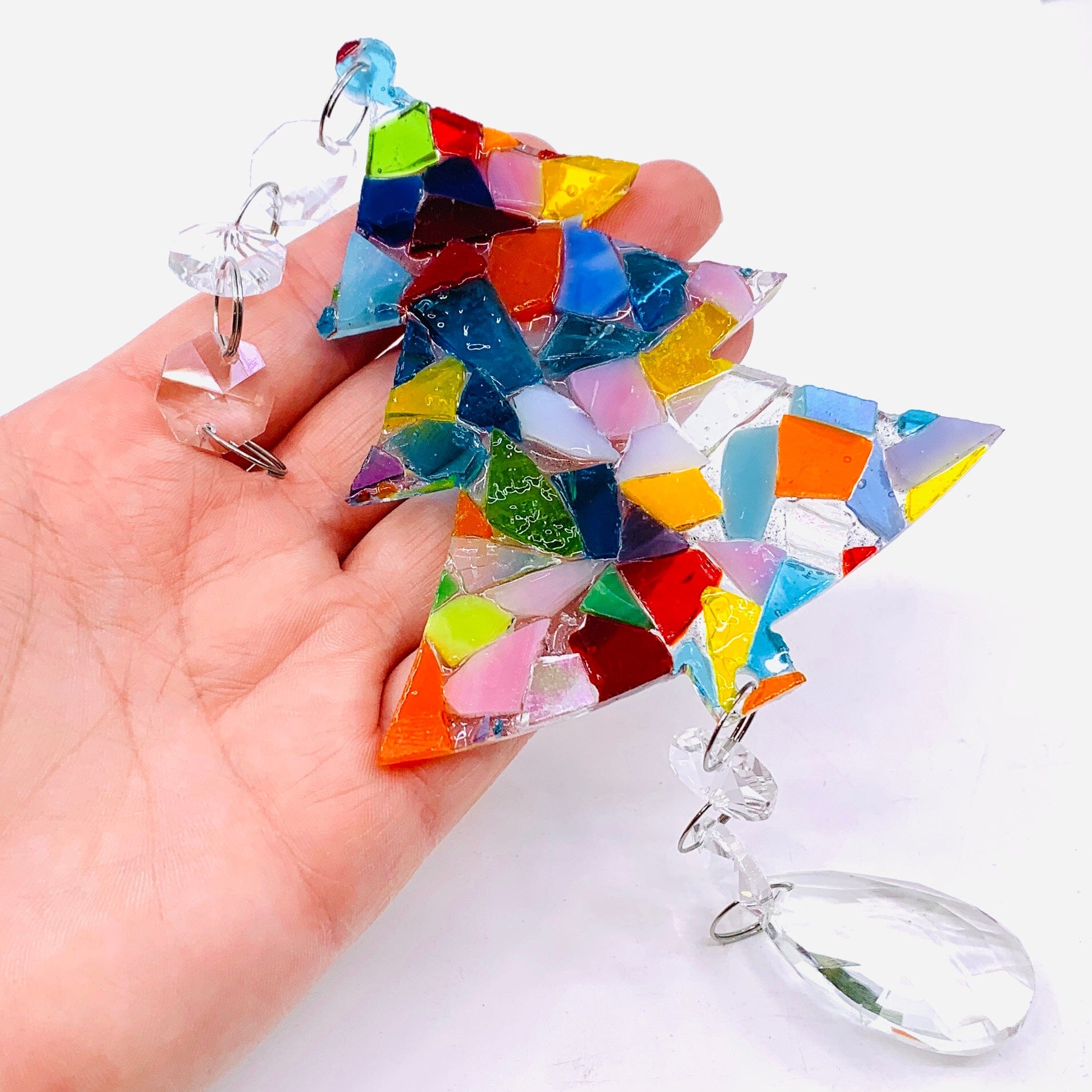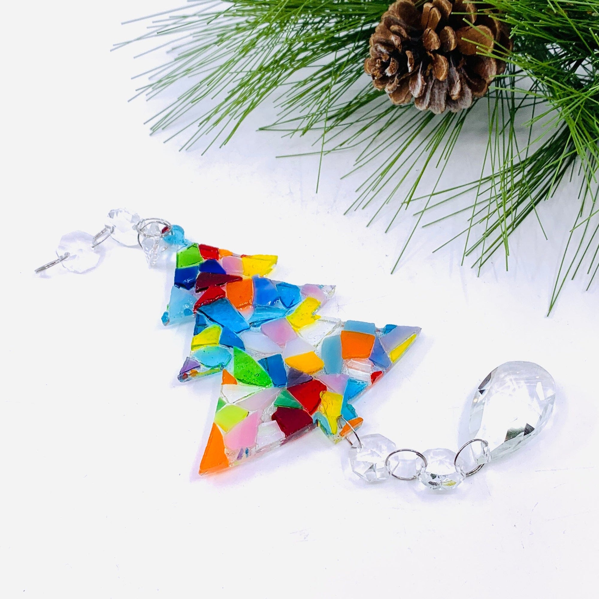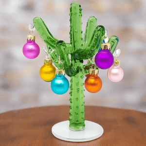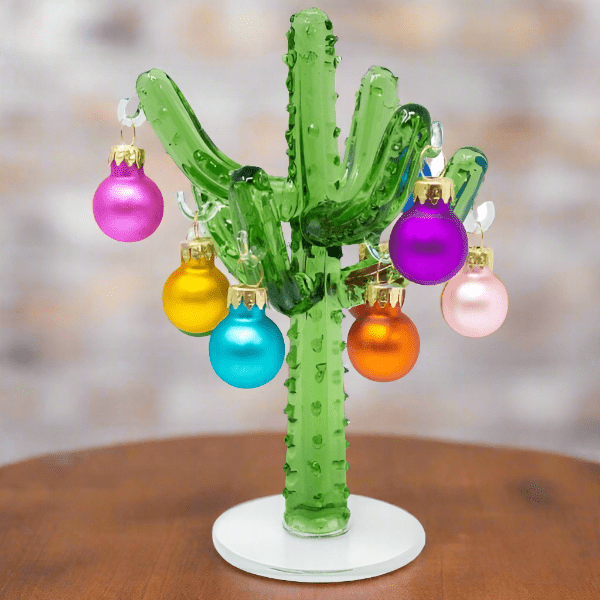 This striking glass christmas catcus is uniquely handmade with multi colored ornaments and serves as a nostalgic decorative piece or a thoughtful gift.