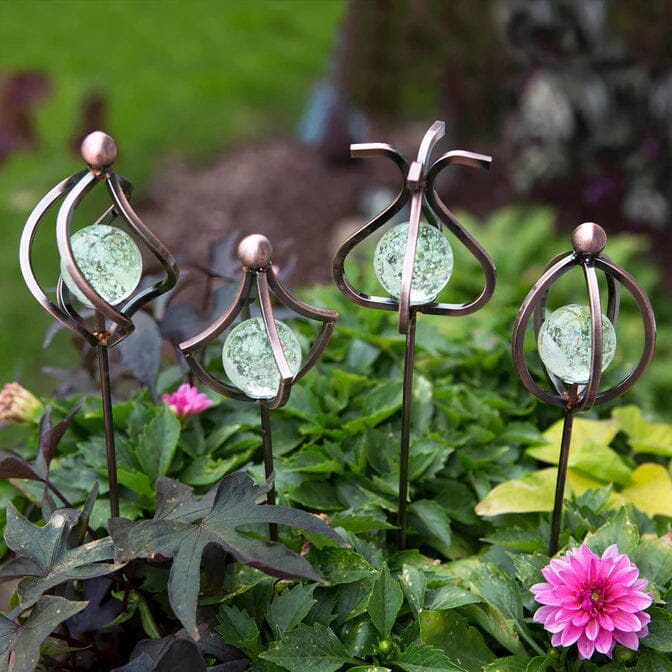 Yard décor has always been a fun and easy way to add color, beauty and life to your yard or garden. Although primarily designed for indoor use, the Glow in the Dark Celestial Pot Stickers from Echo Valley are equally at home outside in a potted plant, fairy garden, container garden or hanging basket as garden art. Luminescent crystals inside the glass marble absorb light energy during the day and release it at dusk in the form of a soft green glow. Glow duration may last up to 3 - 4 hours, gradually fading over that time. All metal parts in these garden accessories have an electroplated antique copper finish applied providing protection from the elements. They can also be used as a support for young starter plants and saplings.