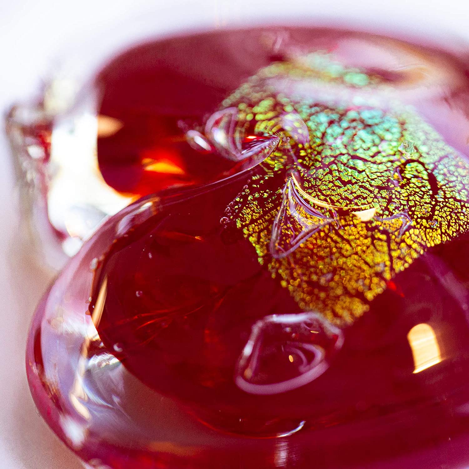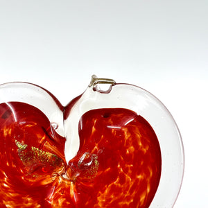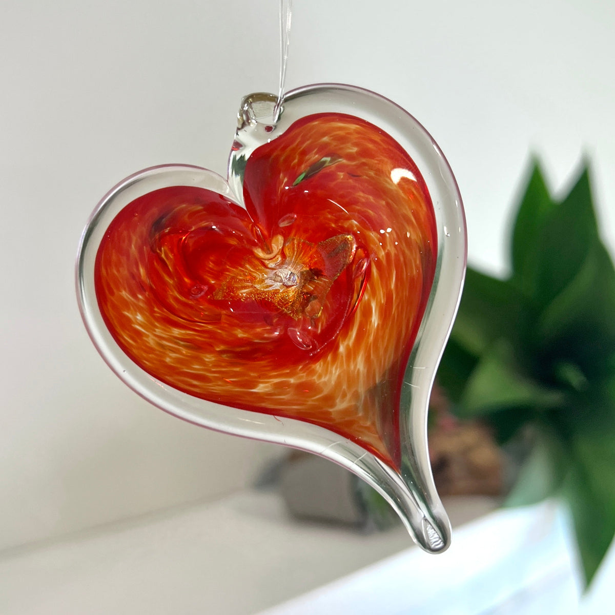 Small Hearts are handblown by a talented team of glassblowers in our studio at Luke Adams Glass in Norwood, Massachusetts. A molten gather of glass is taken from the furnace onto a pipe. The glassblower adds color and reheats. Another layer of clear glass is applied. The glassblower then carefully shapes the glass into a heart and adds a loop. The heart is then placed into an annealer to gradually cool down overnight. Ta-da! A beautifully unique glass heart is born.