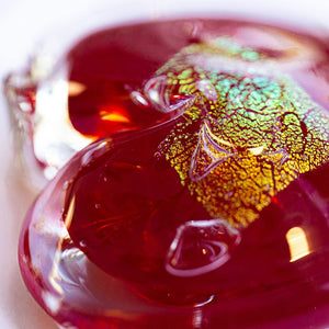 Give the gift of handmade. Handmade glass Hearts feature a sparkly dichroic center and a  loop at the top, making them easy to hang anywhere with ribbon, twine or fishing line. They look great sitting on a desk as a paperweight, or out in the garden. The possibilities are endless.