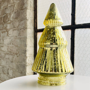 Light up your home with this gorgeous hand-blown mercury glass tree, complete with striking ribbed details in shimmering gold. The textured ridges create a captivating play of reflections that brings sparkle and personality to any corner. Blending whimsical charm with polished elegance, this artisan-crafted treasure makes a delightful statement piece for shelves, tables, or displays. Hunt down all six trees in the series to build a dazzling ensemble that radiates handmade artistry and festive joy!