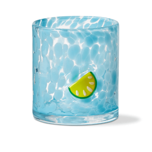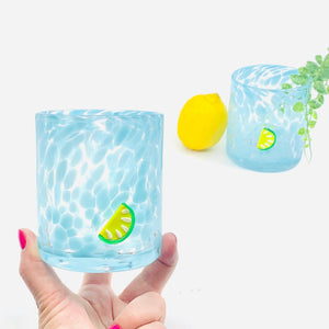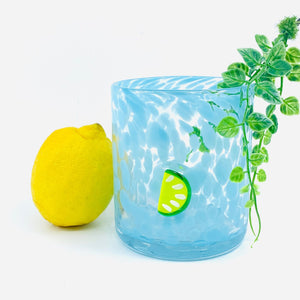 Elevate your next cocktail with the captivating lemon slice confetti double old fashioned glass. this hand-blown masterpiece features vibrant confetti patterns within clear glass, accented by a charming, hand-applied lemon slice icon.
