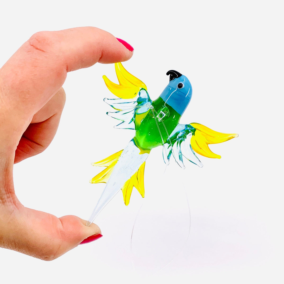 These impressive 3 1/2” tropical birds are incredibly detailed and colorful, and ready to adorn your window. Also great for ornaments.