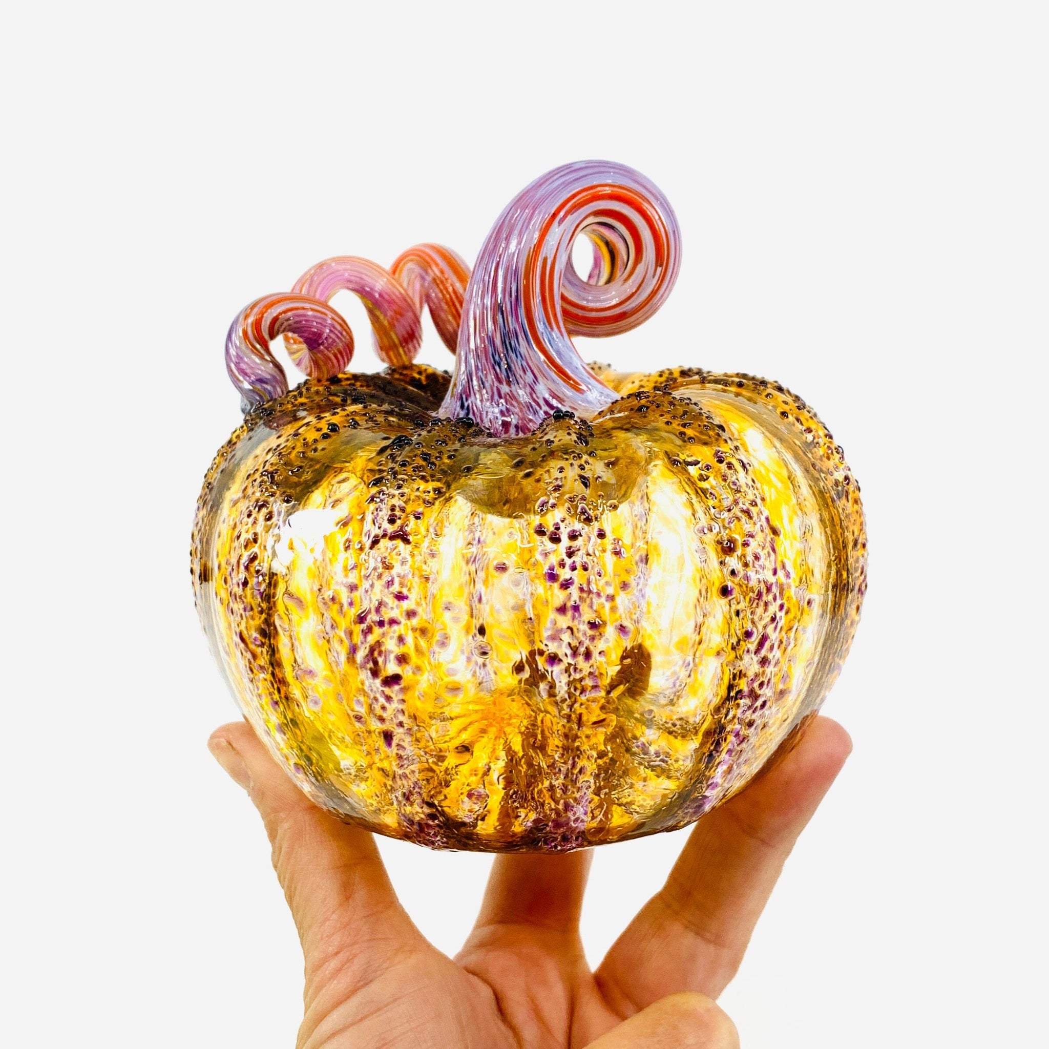What's a daily pumpkin? Daily pumpkins are artfully created by our team of glassblowers. Shapes, sizes, colors, and patterns are at their whim! New pumpkins are posted... you guessed it... daily! Please be aware that descriptive terms (i.e. mini, squat) refer to shape more so than dimensions of our daily pumpkins due to the individuality of these pieces. Size and uniformity may vary.