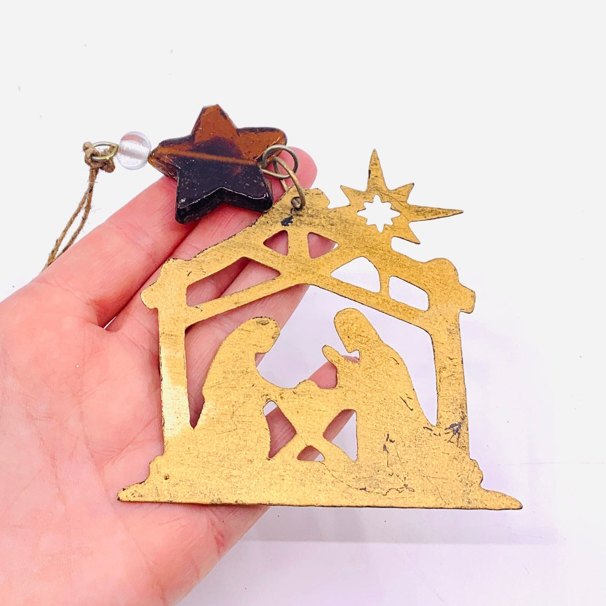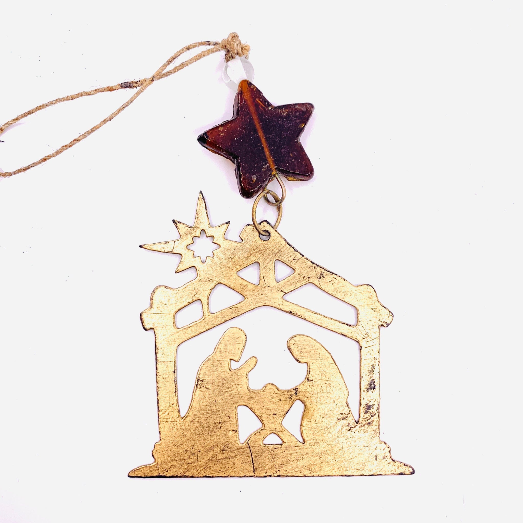 This metal Nativity Ornament with glass bead and star will add a touch of rustic to your holiday decorations. Its design features a beautiful metal nativity scene, glass star and bead. Its perfect for gifting and adding a unique touch to your home this season.