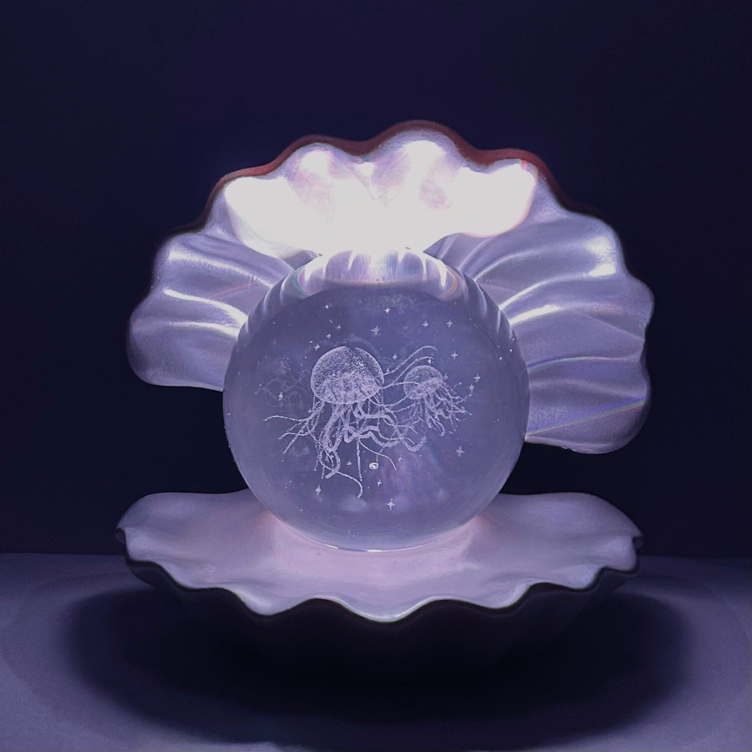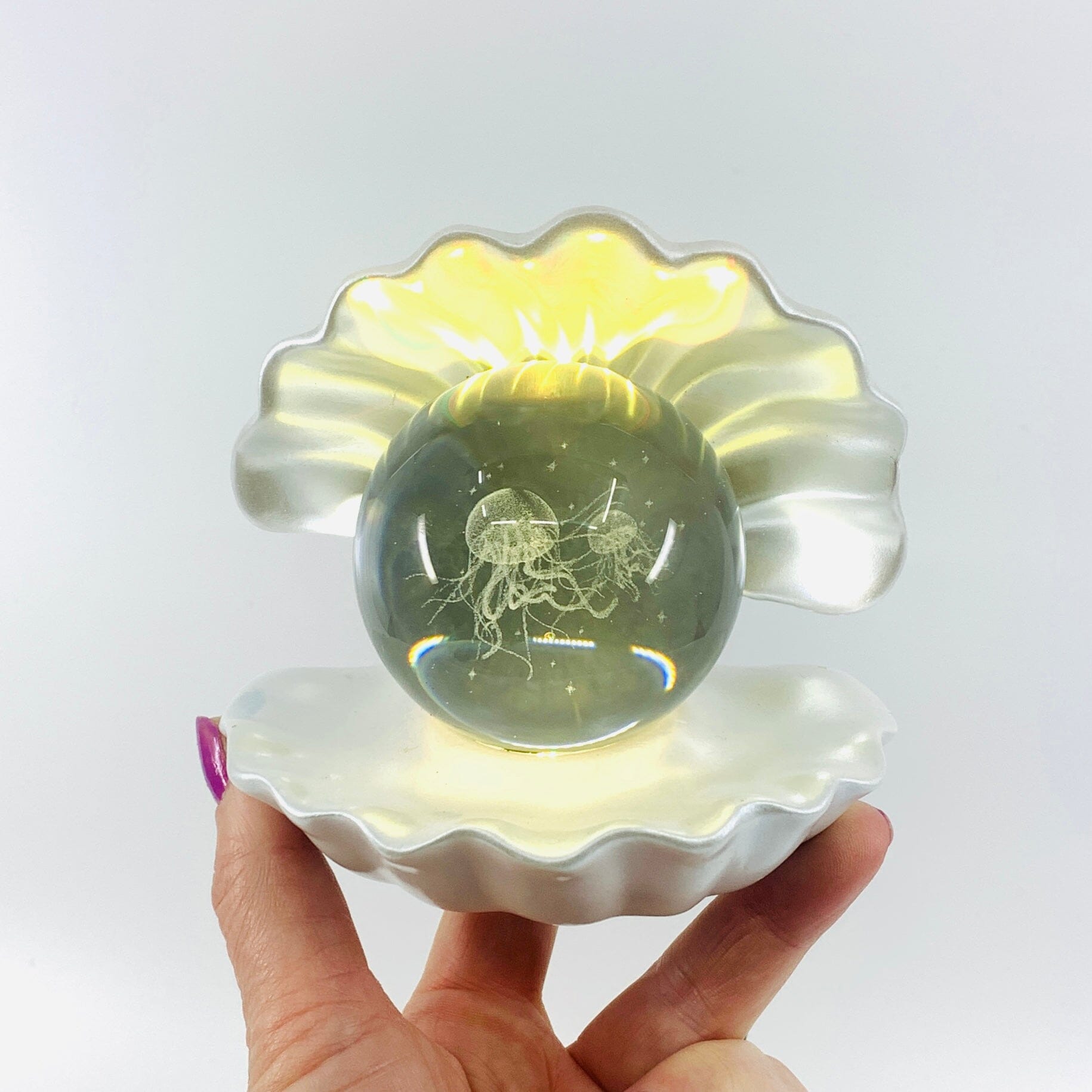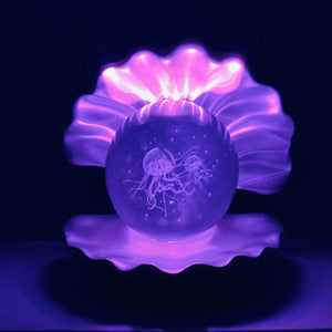 This kitschy light up sea shell lamp has a laser engraved glass pearl nestled inside. The multicolored light illuminates the design and casts a warm, inviting glow that captures the essence of kitschy beachy tranquility. Perfect as a decorative accent piece, it combines kitschy flair and style to your your home. Did we say kitsch. Kitsch. It's so kitschy. Kitsch.