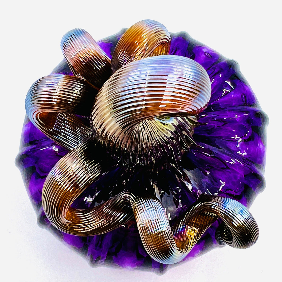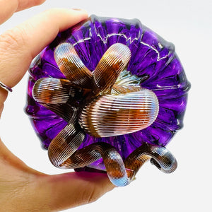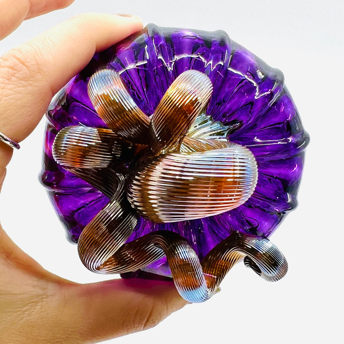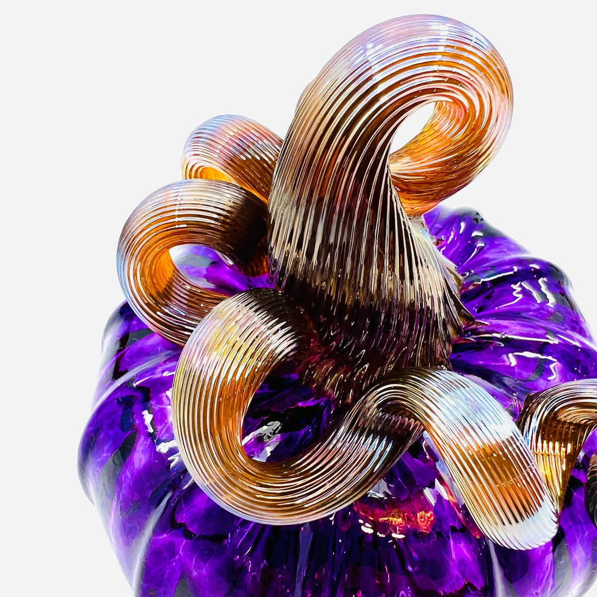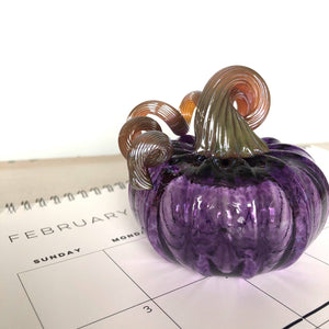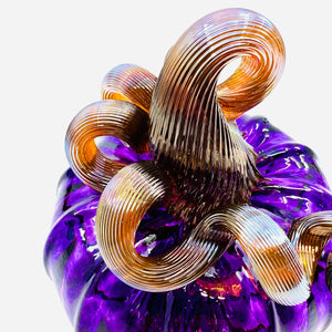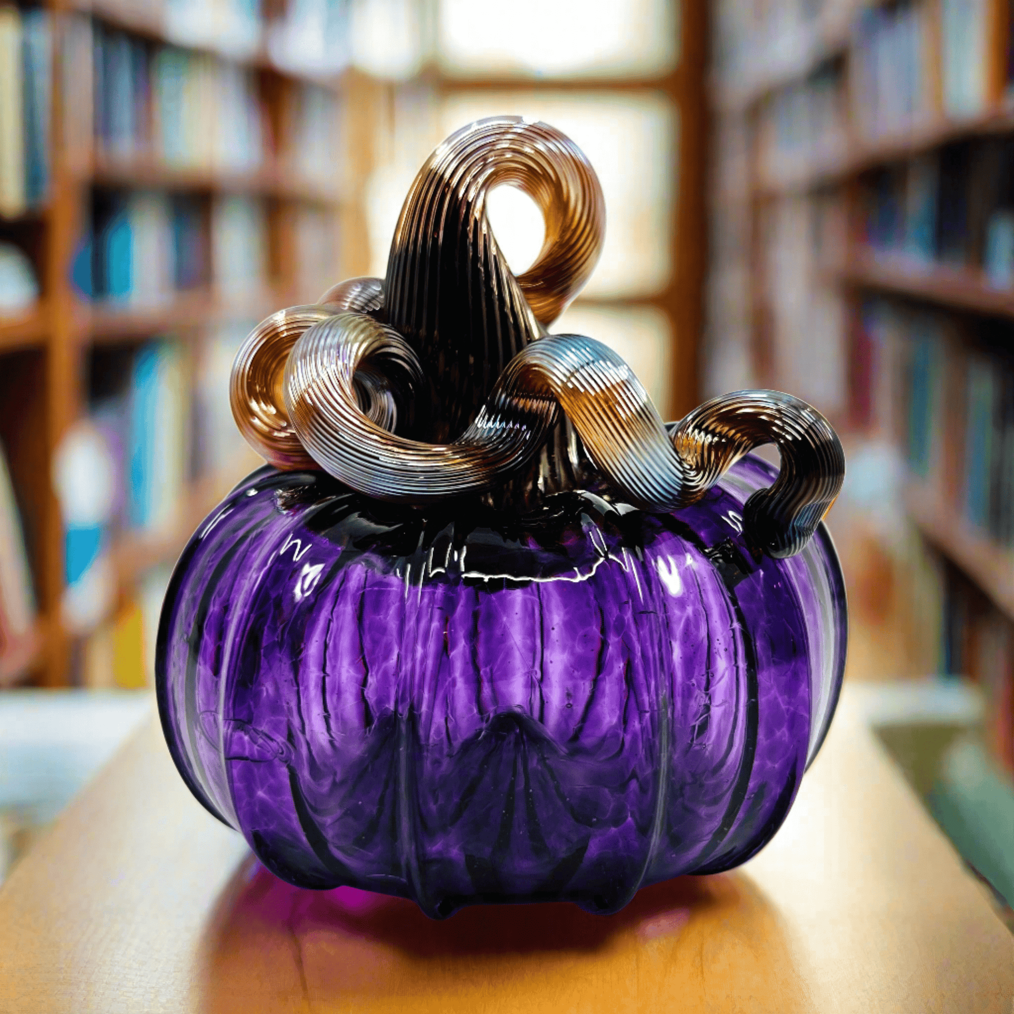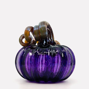 These magical, handmade glass pumpkins make a statement all year round with their rich colors, fine details, and playfully coiled gold stems. Handblown at the Luke Adams Glassblowing Studio in Norwood, MA studio. Pure magic.