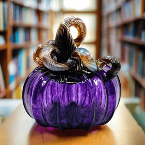Each glass pumpkin is carefully handcrafted, making them all unique in color and shape. Pumpkins start out as a hot blob of glass, gathered off a pipe from a 2,200 degree furnace. The glassblower blows into the pipe to trap a bubble. Pumpkin ridges are added by mold. The glassblower blows again to form the pumpkin base. A metallic glass stem is added to the top. Next, they "cool" overnight in a 900 degree oven. And just like that, a pumpkin is born.