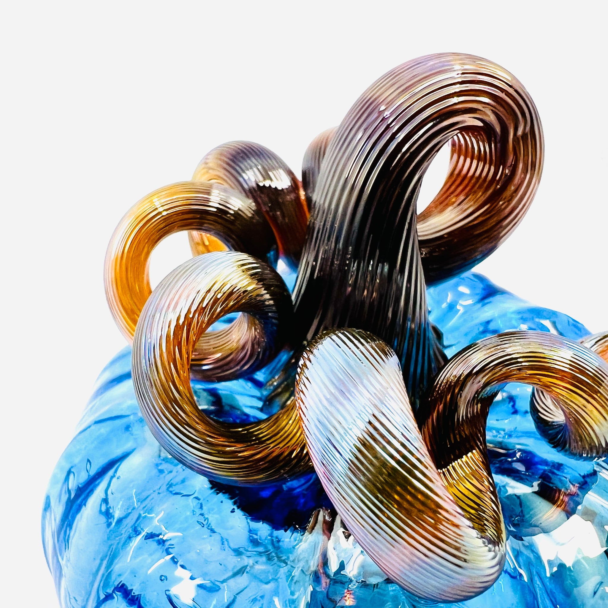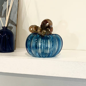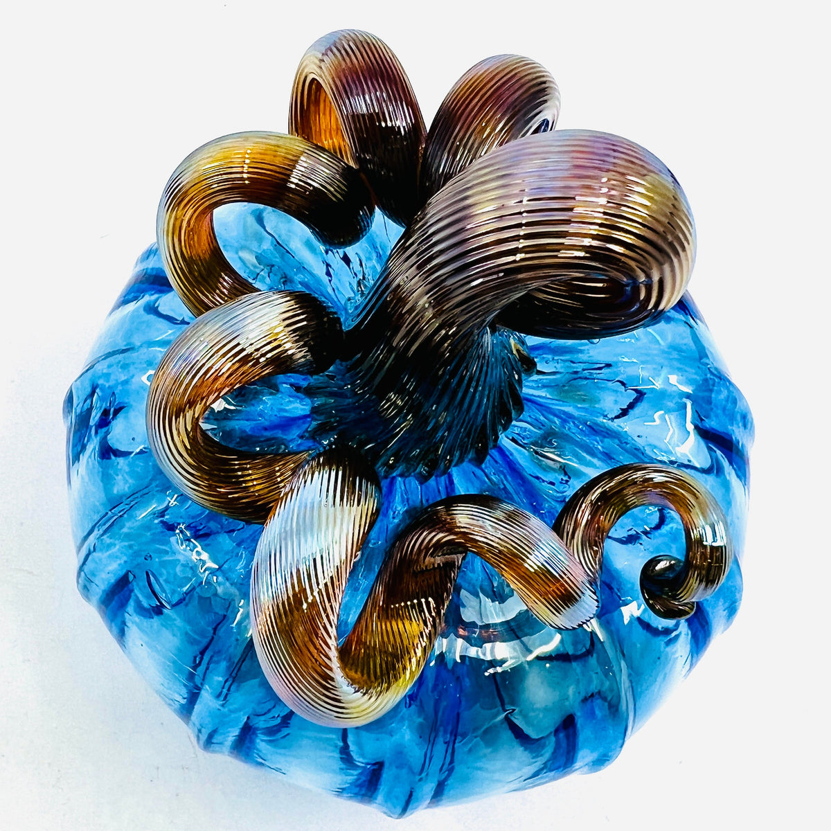These magical, handmade glass pumpkins make a statement all year round with their rich colors, fine details, and playfully coiled gold stems. Handblown at the Luke Adams Glassblowing Studio in Norwood, MA studio. Pure magic.