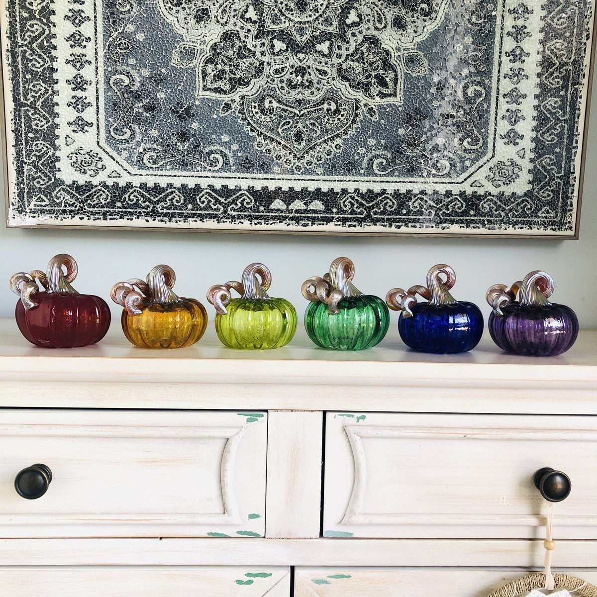 Get this adorable set of 6 mini glass pumpkins to create your own rainbow pumpkin patch. Each mini pumpkin measures approximately 3.5" tall x 3" wide and features a gold stem. ❤️🎃💛💚💙💜