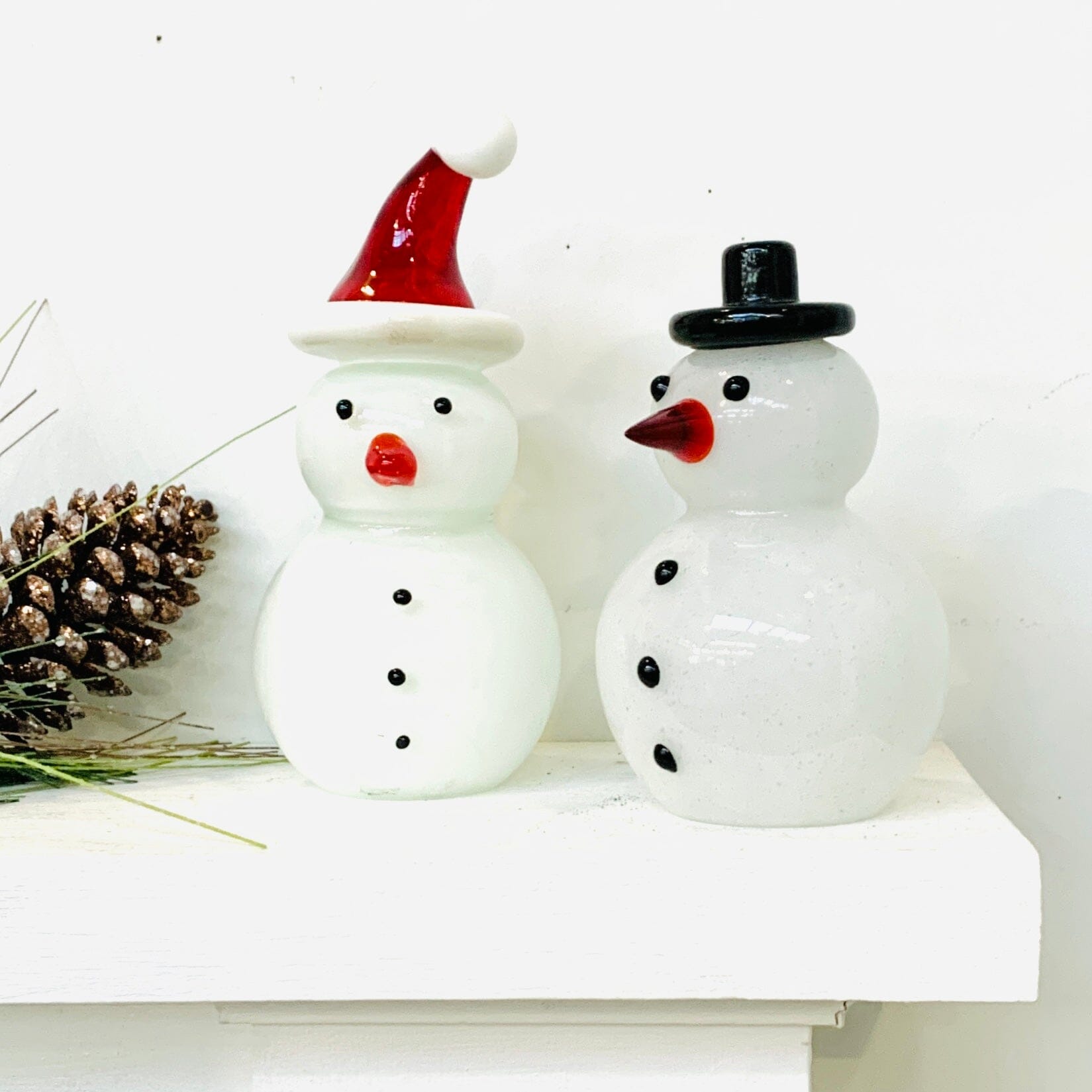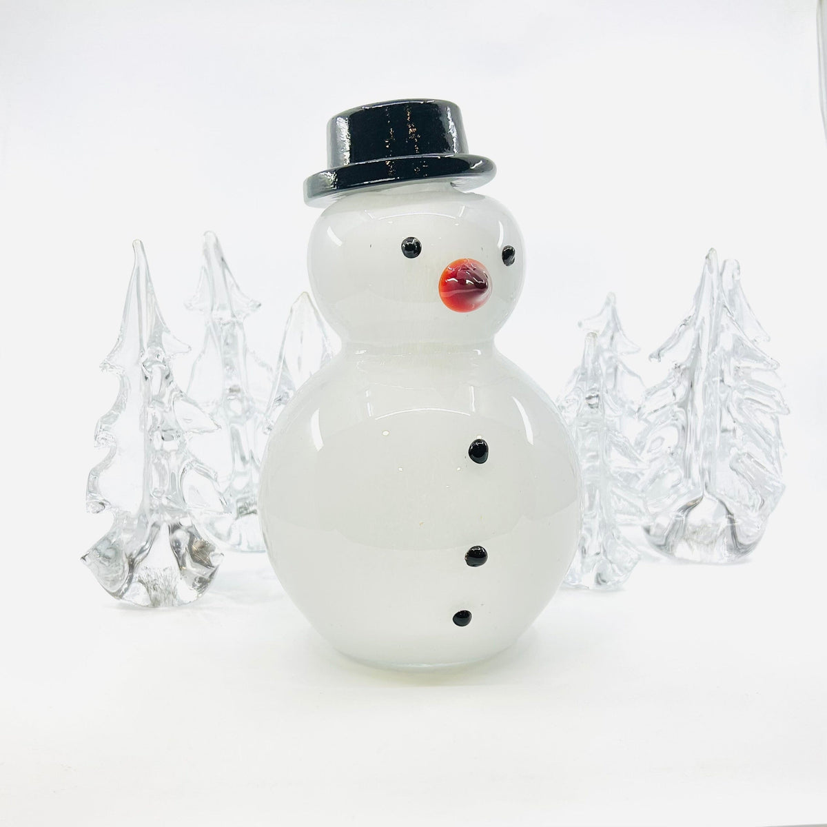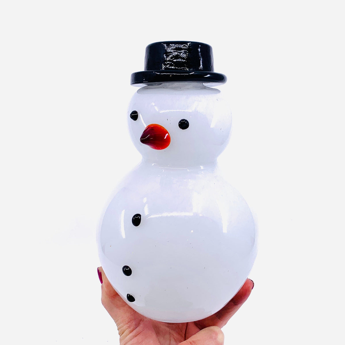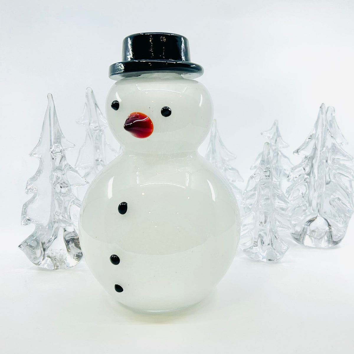 Elevate your décor with Hand Blown Glass Snowman - a stunning and sophisticated addition to any space, any season. Hand blown with a cheeky snowman face and his signature black top hat you will make a statement with this show stopper!