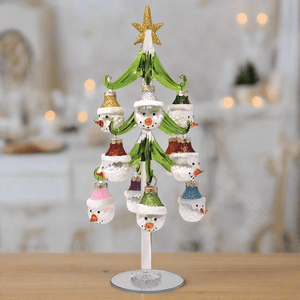 This striking glass tree is uniquely handmade with snowman ornaments and serves as a nostalgic decorative piece or a thoughtful gift.