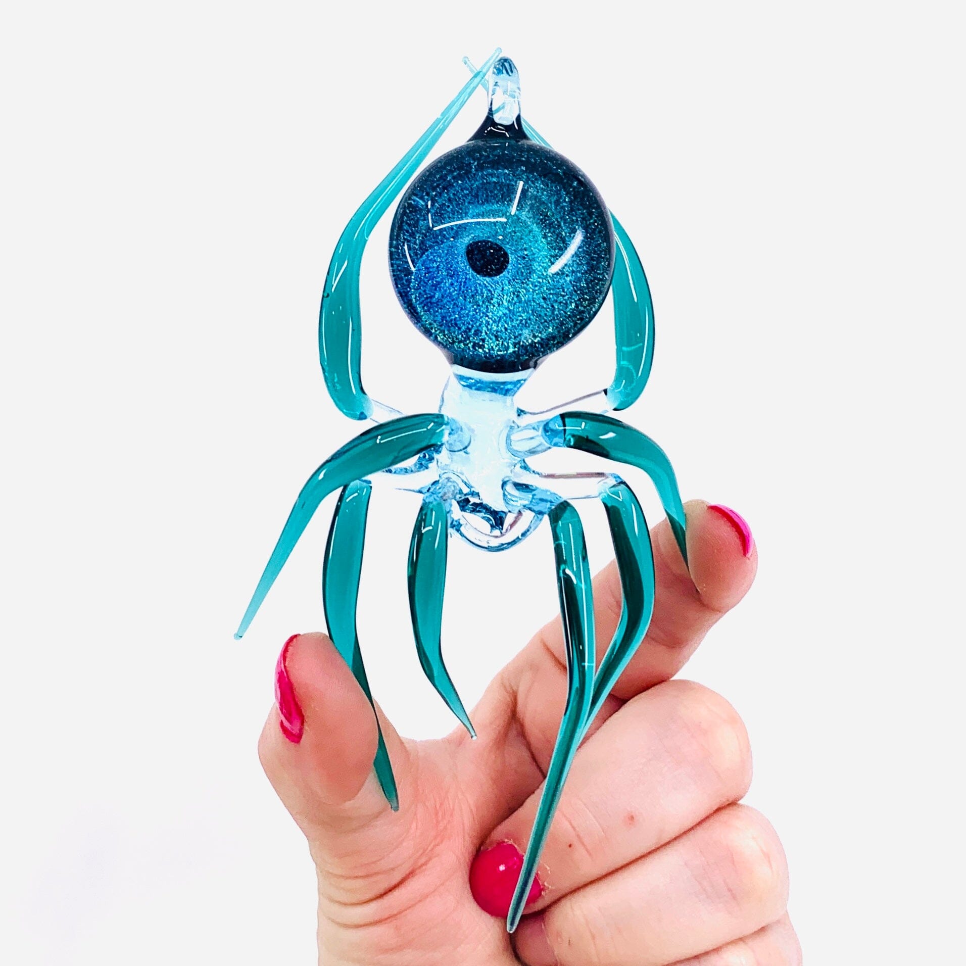 This exquisite hand-blown glass spider boasts a show-stopping dichroic belly. Easily hung as an ornament, it can also be appreciated for its intricate craftsmanship. Each one is one-of-a-kind, available in several different  unique color variants.