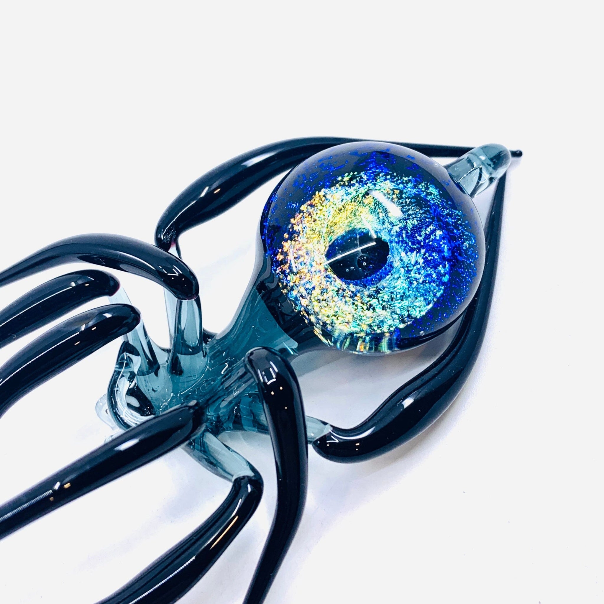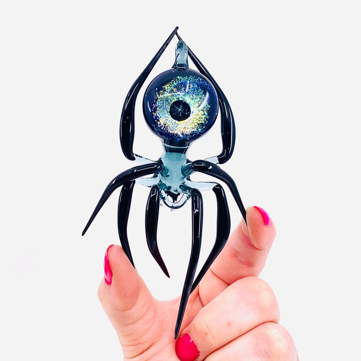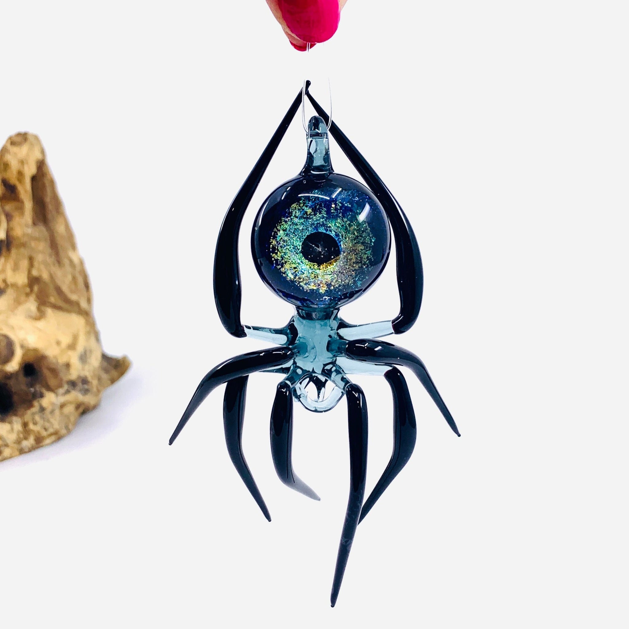 This exquisite hand-blown glass spider boasts a show-stopping dichroic belly. Easily hung as an ornament, it can also be appreciated for its intricate craftsmanship. Each one is one-of-a-kind, available in several different  unique color variants.