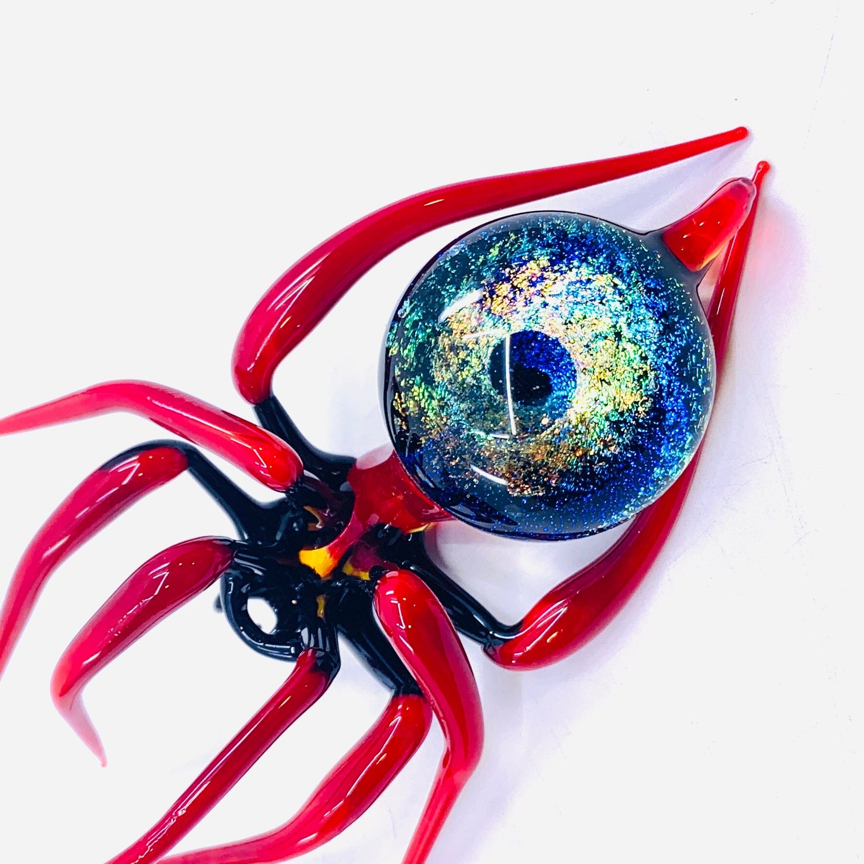 This exquisite hand-blown glass spider boasts a show-stopping dichroic belly. Easily hung as an ornament, it can also be appreciated for its intricate craftsmanship. Each one is one-of-a-kind, available in several different  unique color variants.