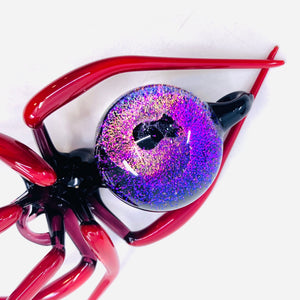 This exquisite hand-blown glass spider boasts a show-stopping dichroic belly. Easily hung as an ornament, it can also be appreciated for its intricate craftsmanship. Each one is one-of-a-kind, available in several different  unique color variants.