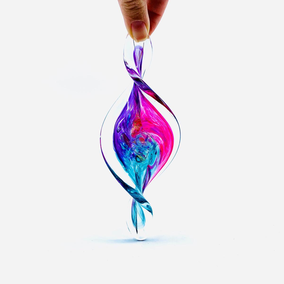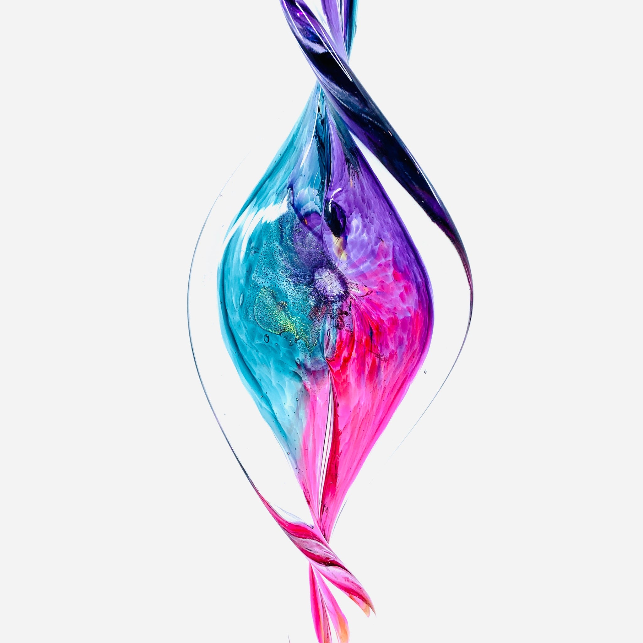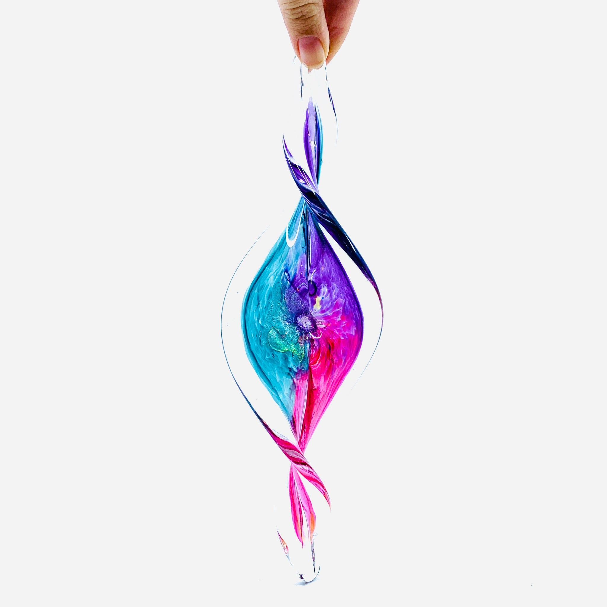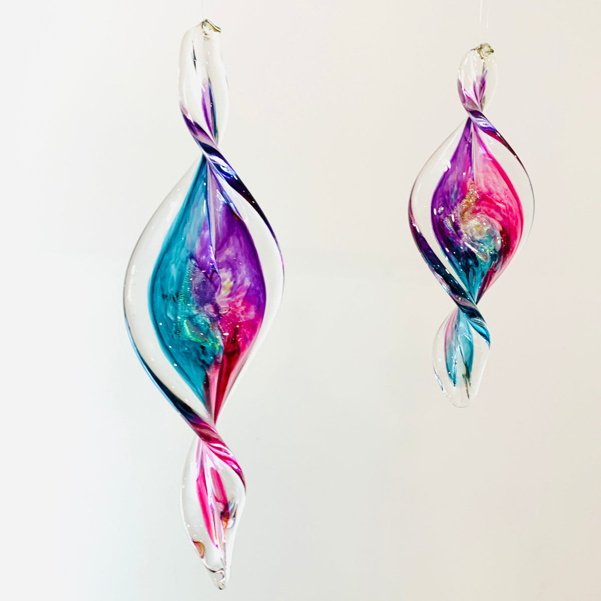 Ornaments, with a twist. Our handmade Spirals are the perfect suncatcher to hang in your window or by a tree branch out in the garden. The glass spiral will gently spin in the breeze, appearing to climb its own string. A unique handmade ornament that catches the light just right.
