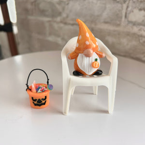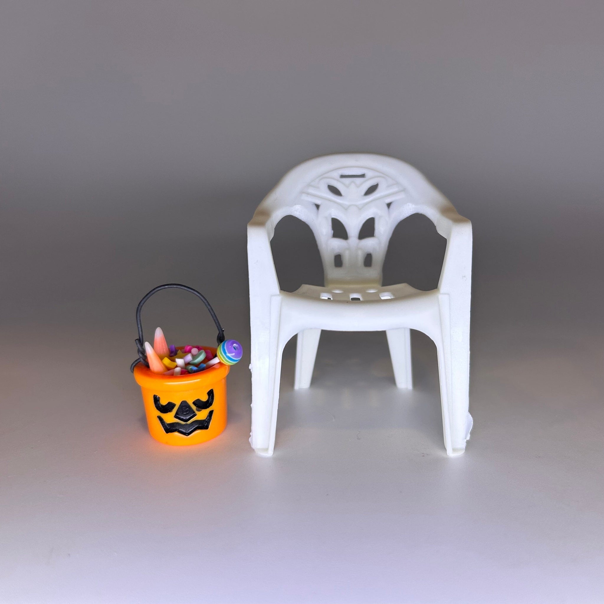 Who got stuck handing out candy this year. Relax in this tiny nostalgic plastic lawn chair and just enjoy the magic of Halloween while passing out candy from your tiny Jack-o-Lantern bucket.