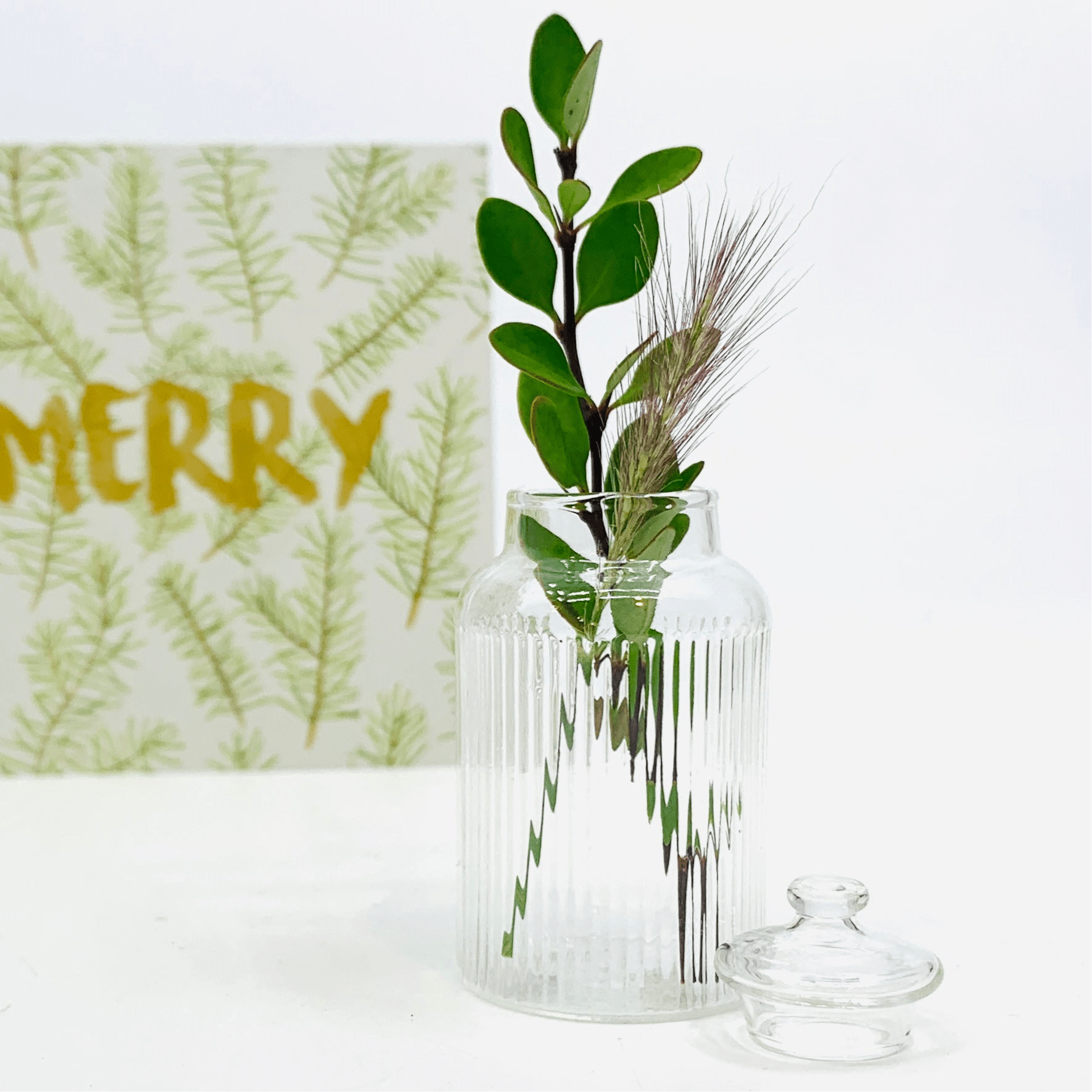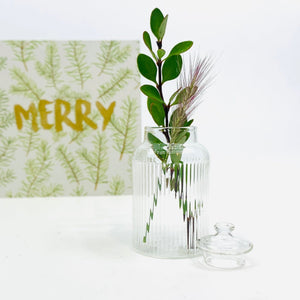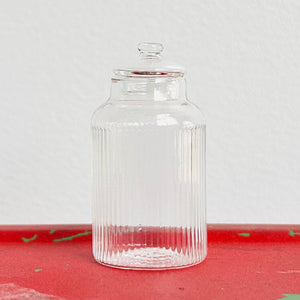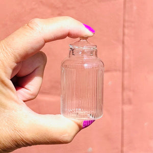 This adorable glass ribbed barrel jar has a tiny removable lid so you can fill it with your tiniest treasures. Jewelry, vacation sand, essential oils the options are endless! It is also fantastic as a tiny vase!