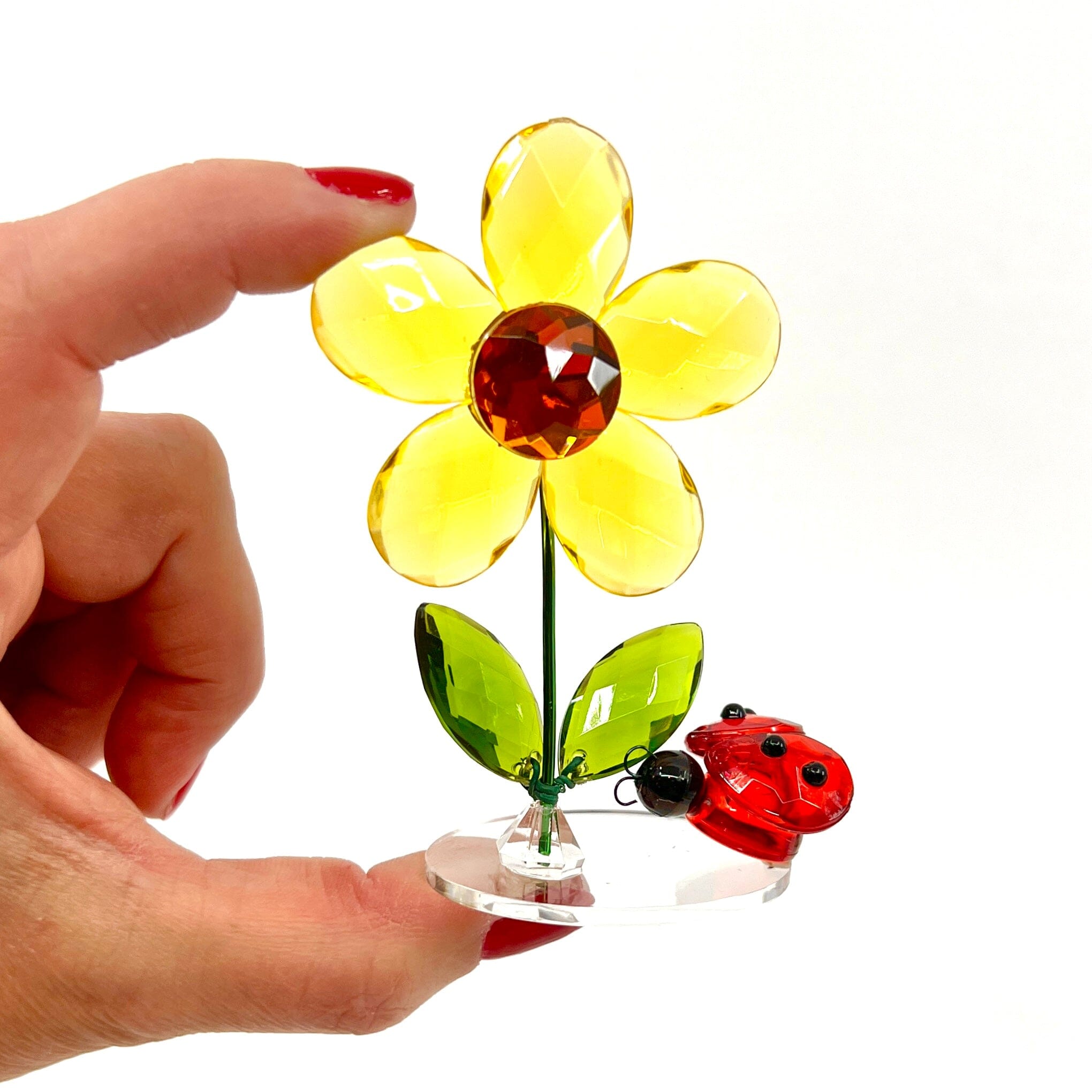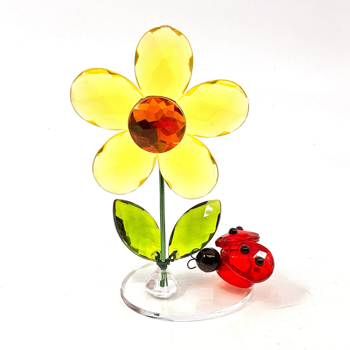 This dazzling acrylic Daisy is adorned with a sparkling garden friend! A perfect addition for spring décor and a thoughtful gift.