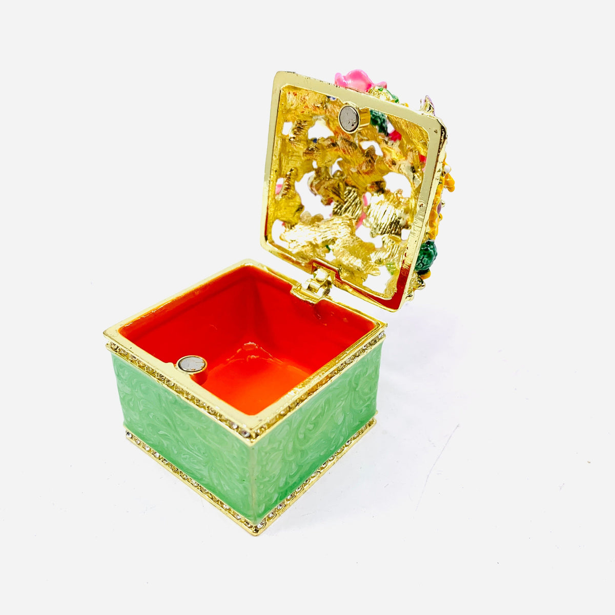 This beautiful trinket box is made of enamel over pewter with Swarovski crystals. These Trinket boxes are hinged at one end and has a magnetic closure.