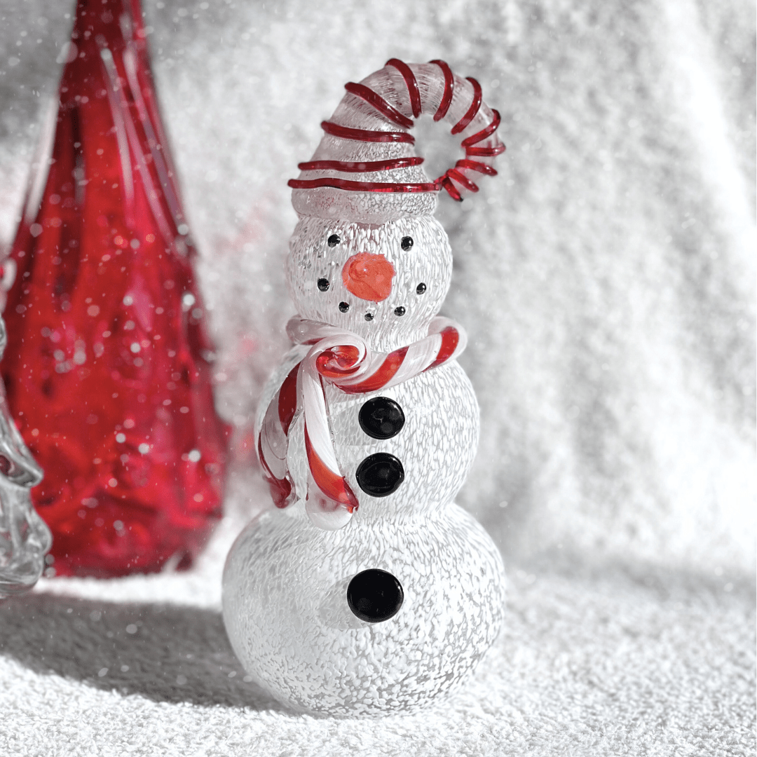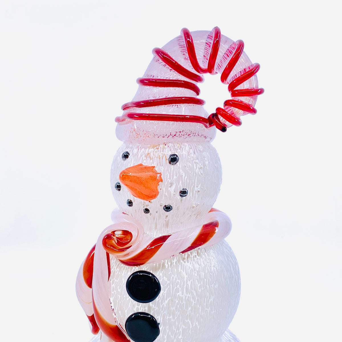 Elevate your décor with Hand Blown Glass Snowman - a stunning and sophisticated addition to any space, any season. Hand blown with a cheeky snowman face and his signature red striped hat you will make a statement with this show stopper!