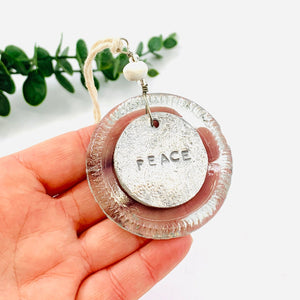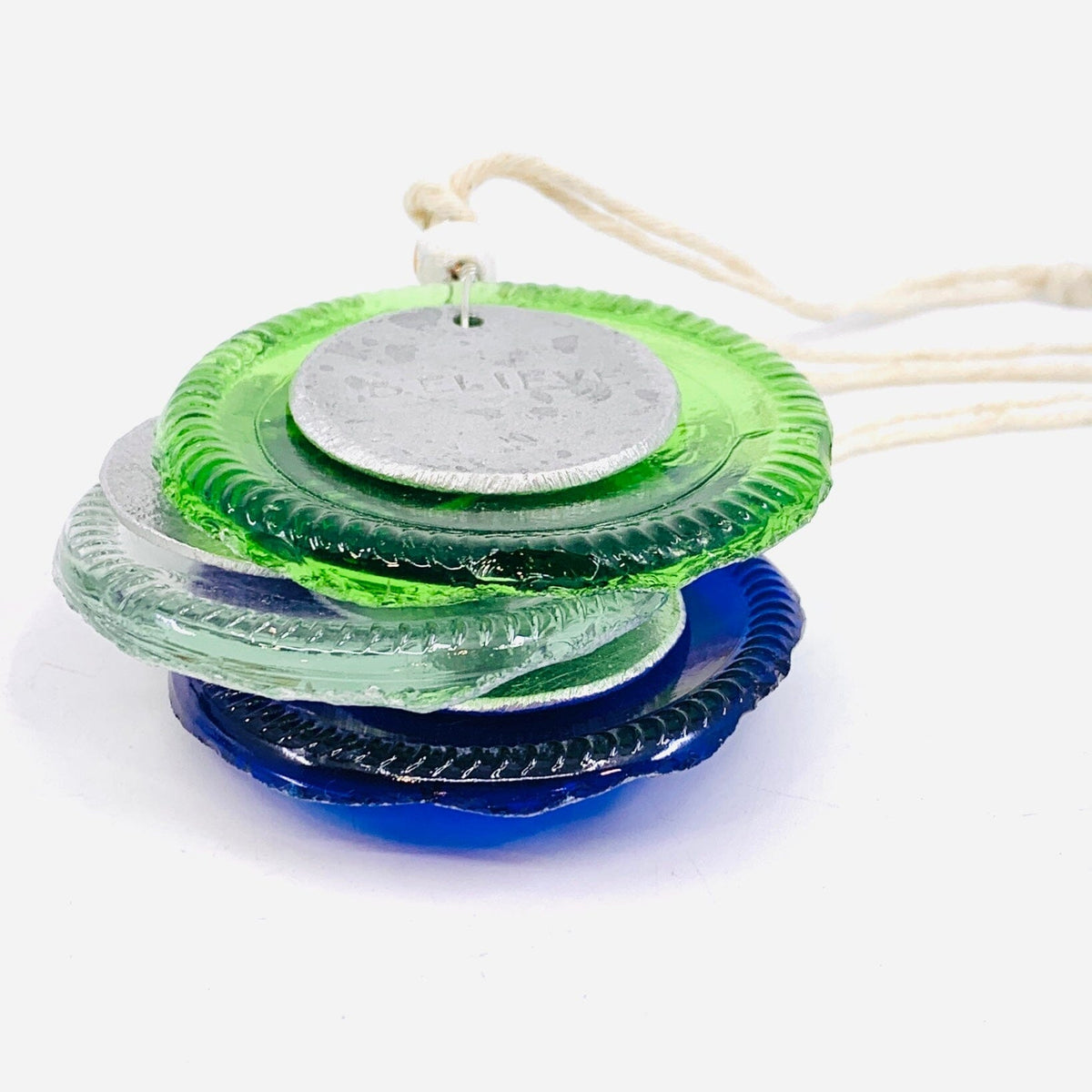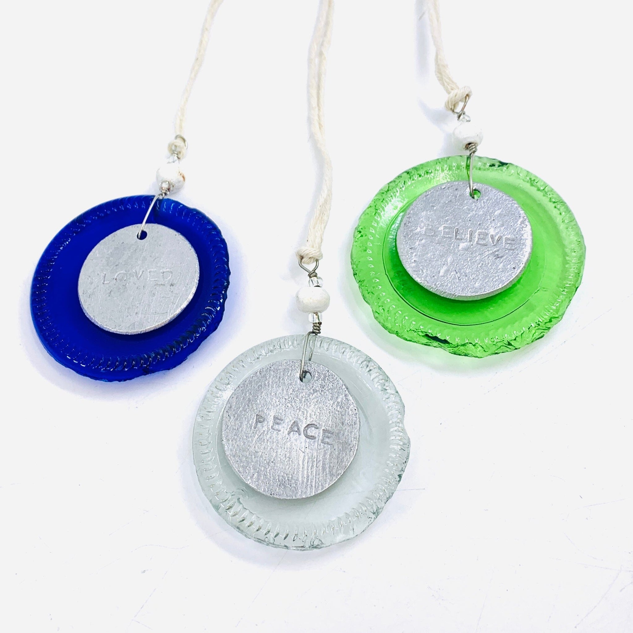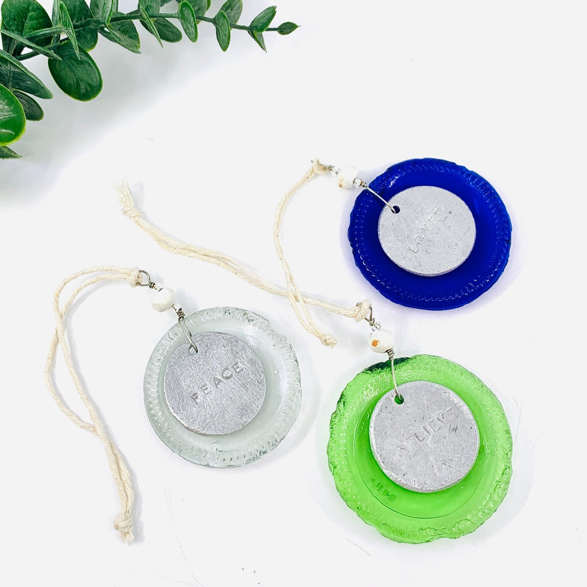These bottom bottle ornaments are created up of upcycled aluminum circles stamped with some of our favorite words, upcycled cured bottle bottom and a locally-sourced clay bead.