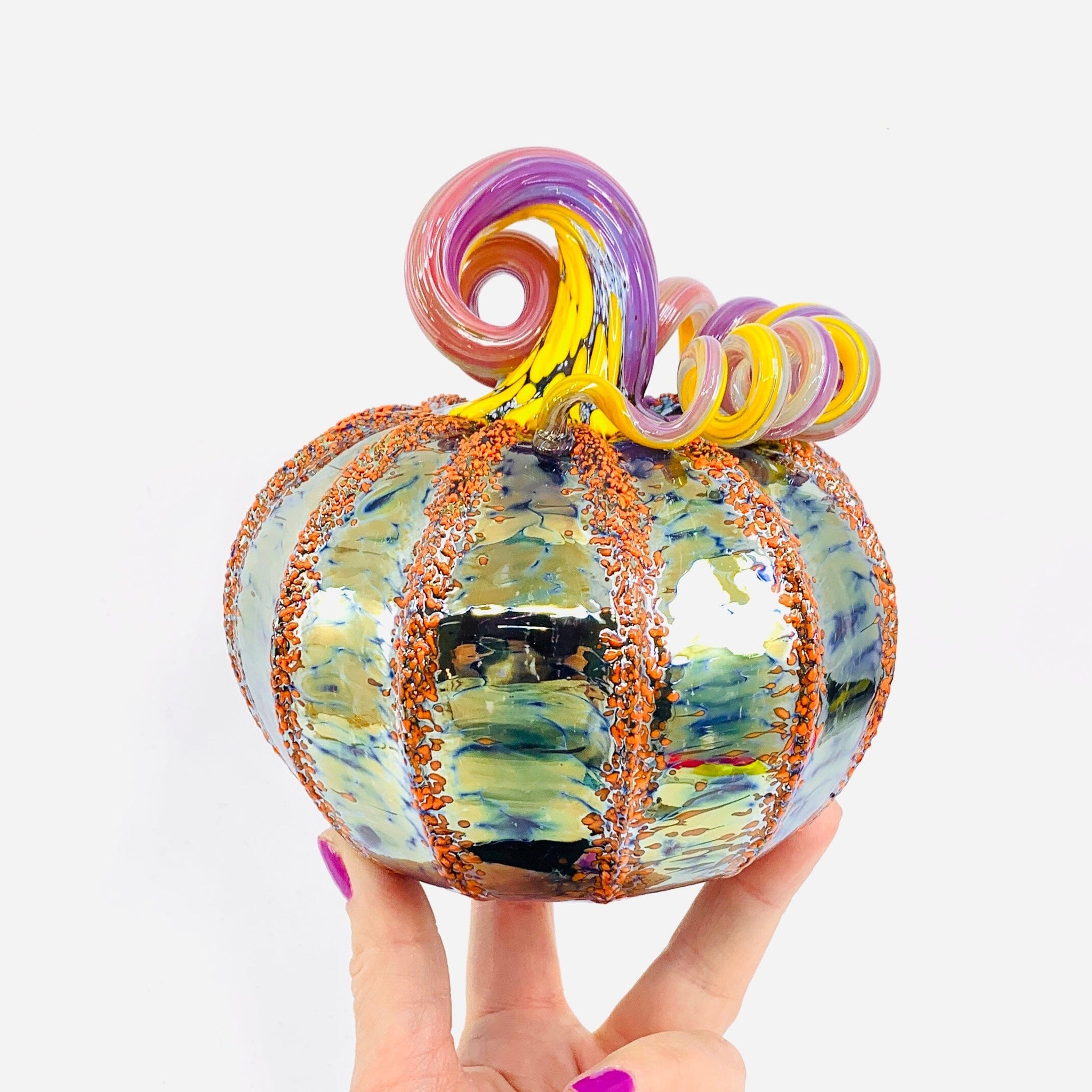 What is a Daily Pumpkin? Every day brings a fresh creation from our glassblowing studio! Our Daily Pumpkins are one-of-a-kind pieces where our artisans let their creativity run wild—no two are exactly alike. Each pumpkin showcases unique colors, patterns, and silhouettes, making yours truly special. Shape descriptors like "mini" or "squat" capture the vibe rather than precise measurements, so expect delightful variations in size and character. Check back daily for new arrivals!