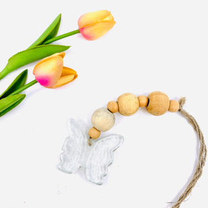 Bring a pop of color to your garden this spring with these beautiful glass suncatchers with a wooden bead design and a glass butterfly adorning the bottom! Available in a 4 different colors collet them all and make your garden shine this spring!