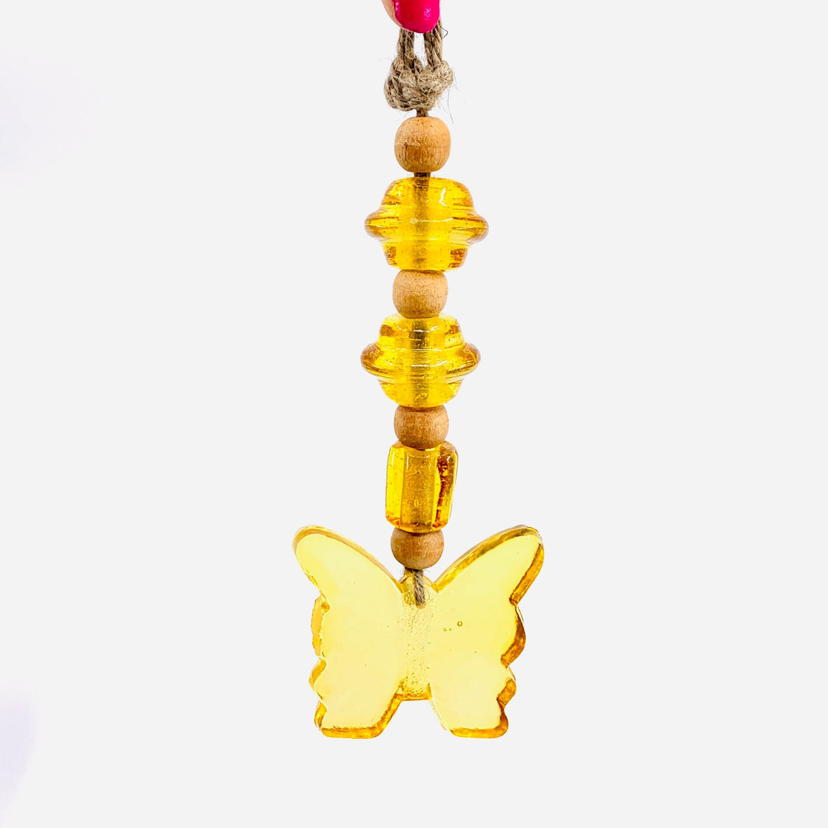 Bring a pop of color to your garden this spring with these beautiful glass suncatchers with a wooden bead design and a glass butterfly adorning the bottom! Available in a 4 different colors collet them all and make your garden shine this spring!