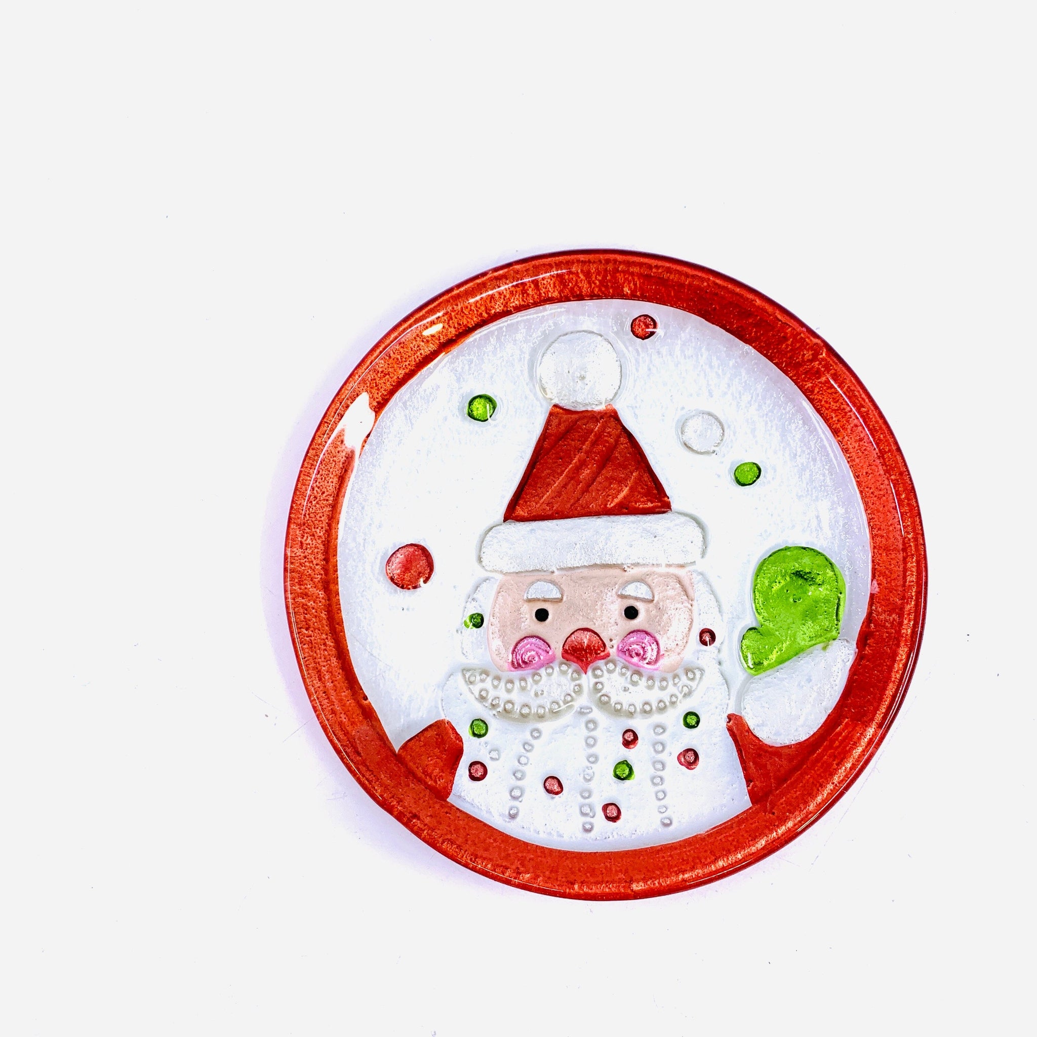 Our Glass Fusion collection turns cheerfulness and whimsy into usable, glass works of art. The Santa Mini Round Plate is perfect for the holiday season, serve cupcakes, cake, snack foods and more on this artisan glass platter. Perfect for loved ones or give to someone else. There's always room in the home for joy, celebration and creativity.