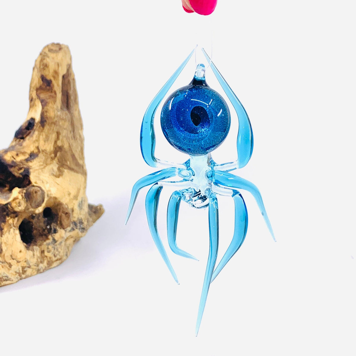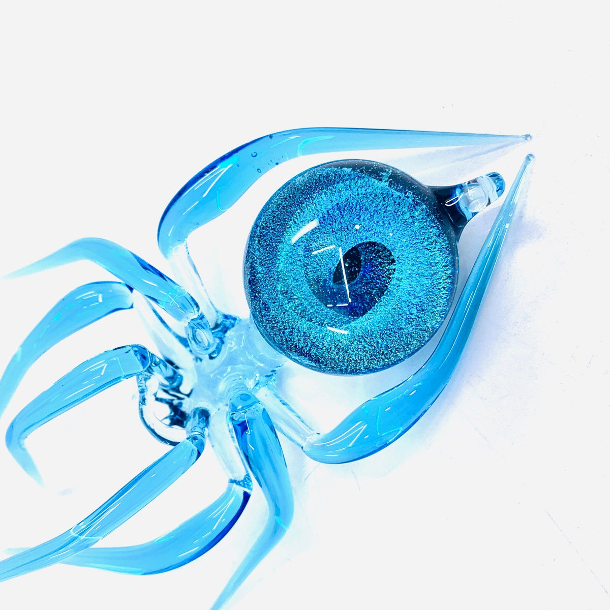 This exquisite hand-blown glass spider boasts a show-stopping dichroic belly. Easily hung as an ornament, it can also be appreciated for its intricate craftsmanship. Each one is one-of-a-kind, available in several different  unique color variants.