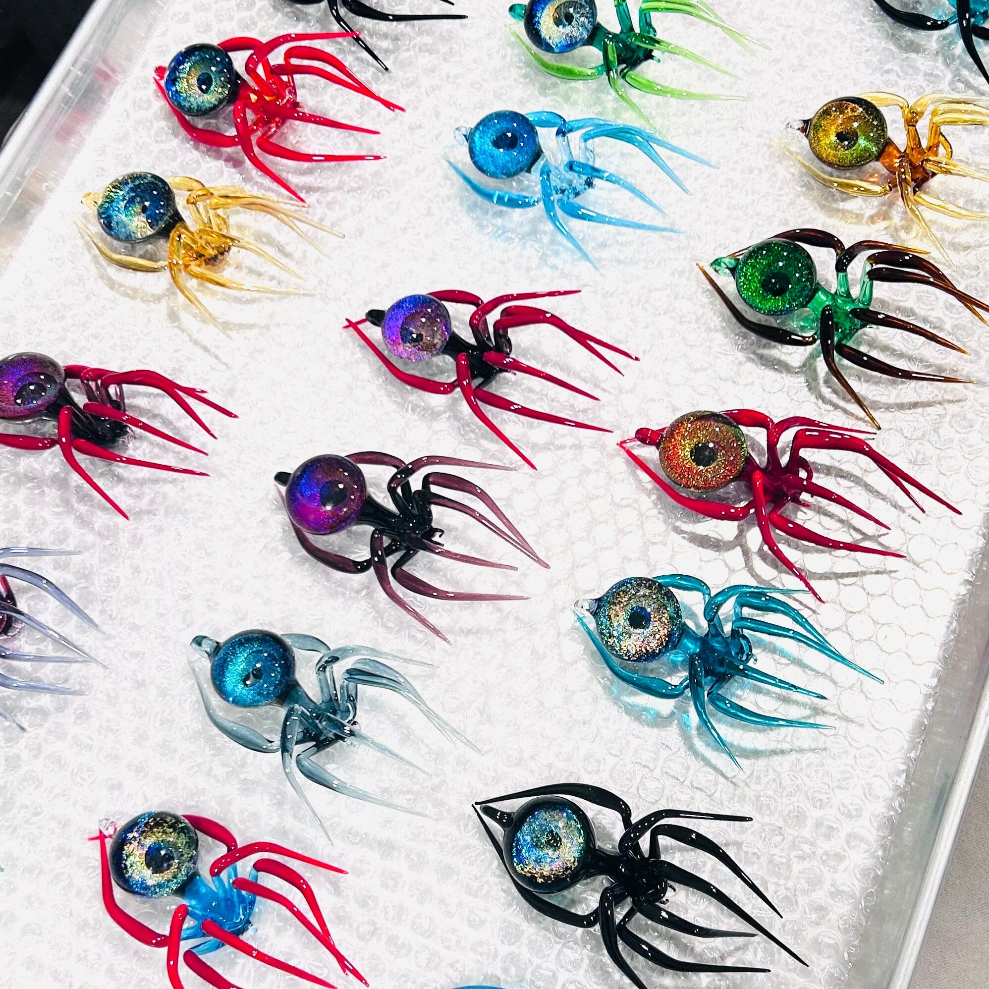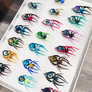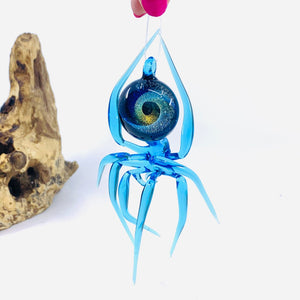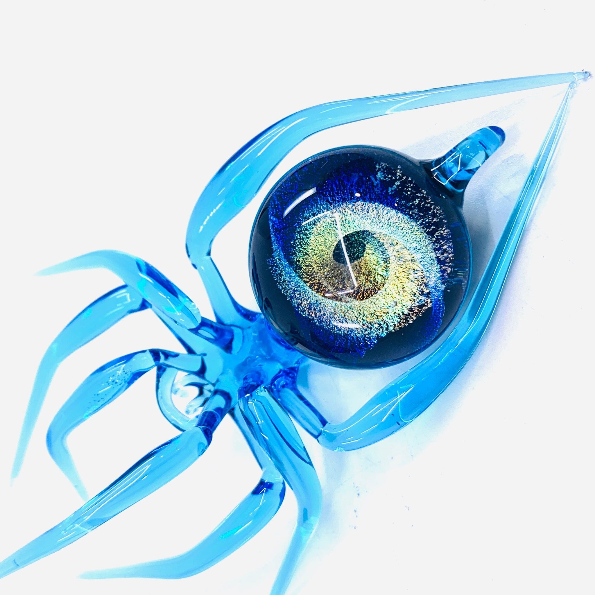 This exquisite hand-blown glass spider boasts a show-stopping dichroic belly. Easily hung as an ornament, it can also be appreciated for its intricate craftsmanship. Each one is one-of-a-kind, available in several different  unique color variants.