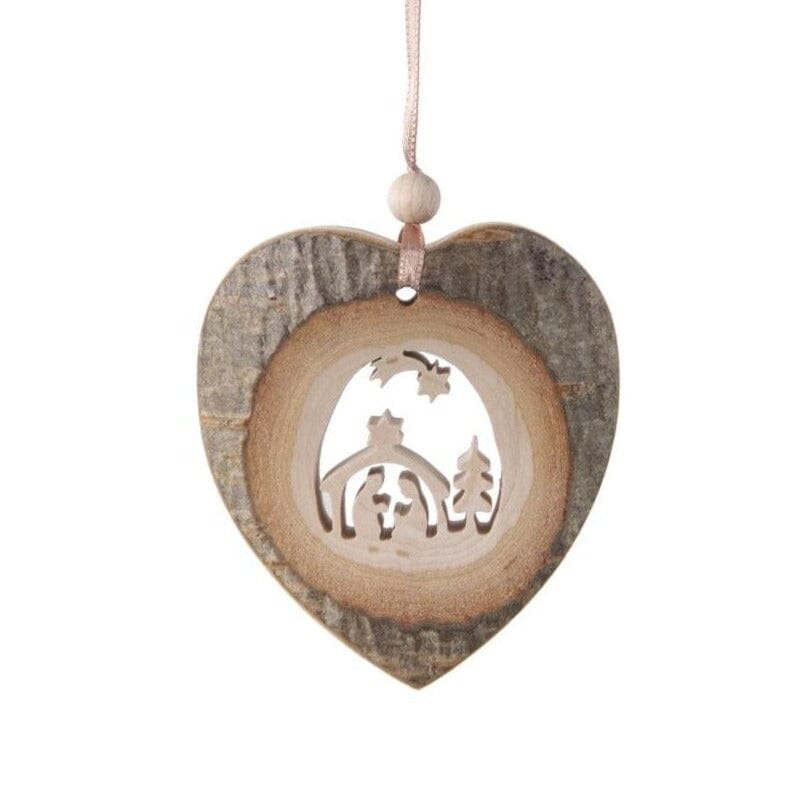 A stunningly crafted nativity scene adorns this wooden heart ornament, perfect for gifting to new moms, loved ones, or as a holiday decoration. Hand-carved in Italy, this natural bark ornament is sure to inspire and enchant.